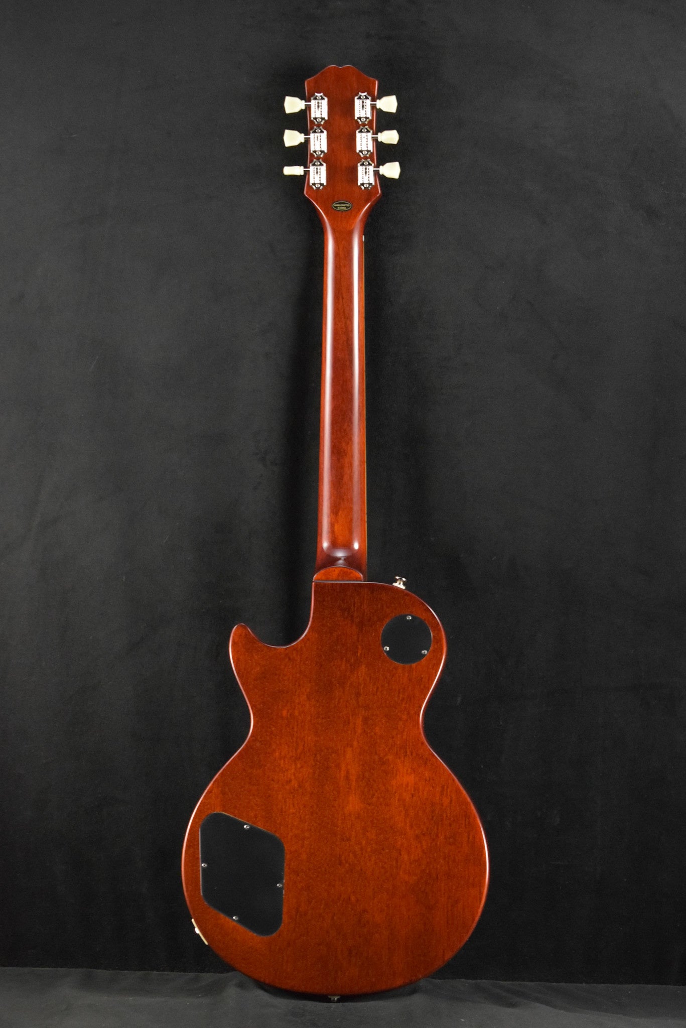 Epiphone’s Inspired by Gibson™ Collection proudly presents the Les Paul™ Standard 50s! This guitar lovingly recreates the feel and tone of the 1950s-era Les Pauls. Epiphone’s long friendship with Mr. Les Paul began in 1940 when Les built one of the world’s first solidbody electric guitars while working nights at the original Epiphone factory in Manhattan. Les’ first solidbody guitar, nicknamed “the Log,” would go on to inspire the Les Paul Standard, which many consider the greatest electric guitar ever made. This guitar is crafted with a mahogany body, maple cap with AAA flame maple veneer, bound ’59 Rounded Medium C-shaped mahogany neck with long neck tenon, laurel fretboard with classic trapezoid inlays, Epiphone’s Vintage Deluxe tuners, a pair of critically acclaimed Epiphone Probucker™ humbuckers™, and gold Top Hat knobs with dial pointers. This Epiphone Inspired by Gibson Original model also has the Kalamazoo headstock, Graph Tech® nut, era-appropriate wiring, and CTS® pots. A premium gig bag is also included.