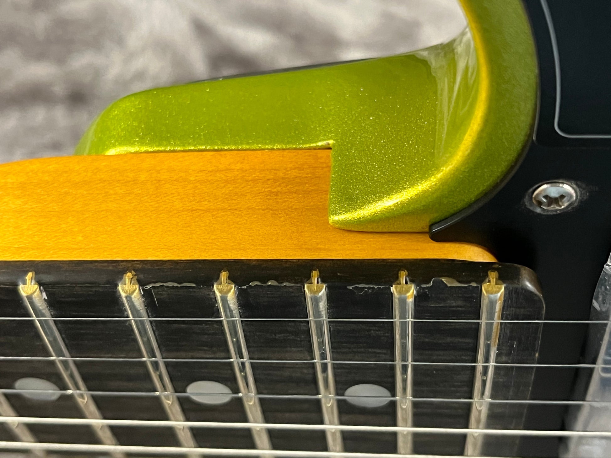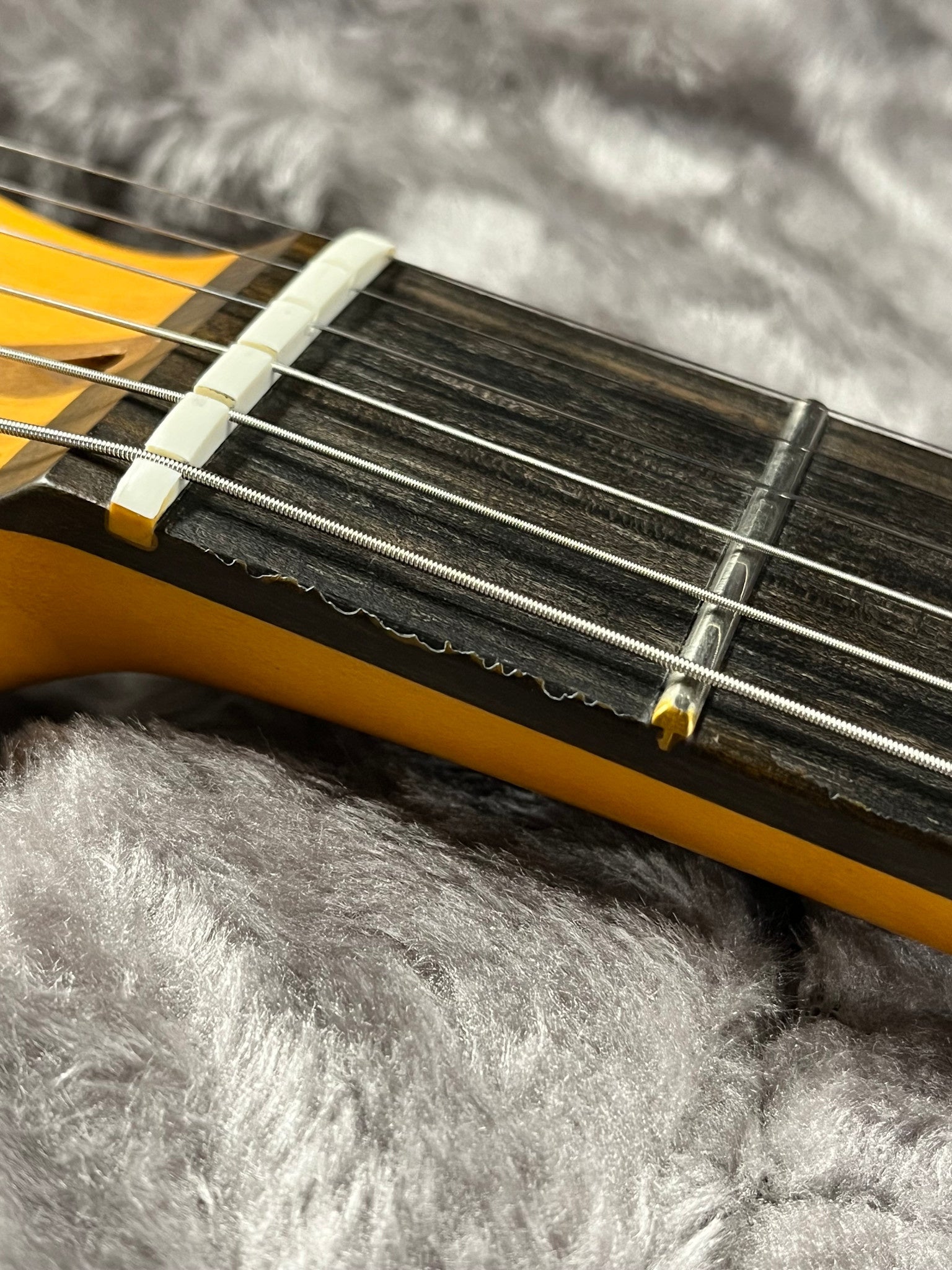 Scratch and Dent Discount: See photos of the imperfections on the roll edges of the fretboard. There is one spot at the first fret and then an area around the upper frets where the finish has flaked.