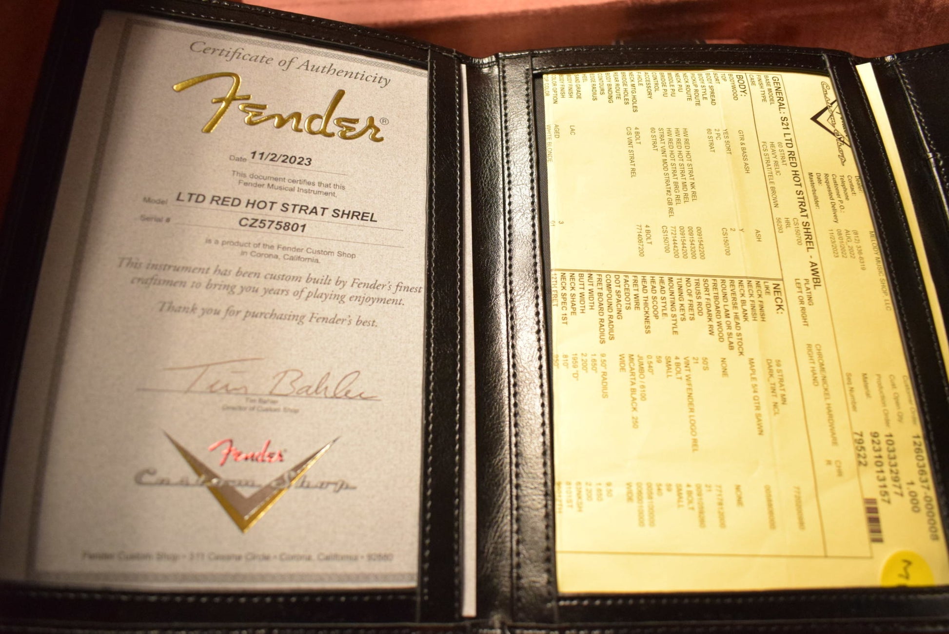 Super Heavy Relic® Lacquer Finish; 2-Piece Select Ash Body; 1-Piece Quartersawn Maple Neck with '59 Style "D" Back-Shape; 9.5" Radius; 21 Jumbo (6100) Frets; Hand-Wound Red Hot Strat® Pickups; Vintage Modified #2 wiring with Tone-Saver Bleed; 5-Way Switch; 1-Ply 11-Hole Parchment Pickguard; Custom Shop Vintage Synchronized Tremolo; Vintage-Style Tuning Machines; Bone Nut; Wing String Tree with Tall Metal Spacer; Deluxe Hardshell Case; Strap; Certificate of Authenticity.