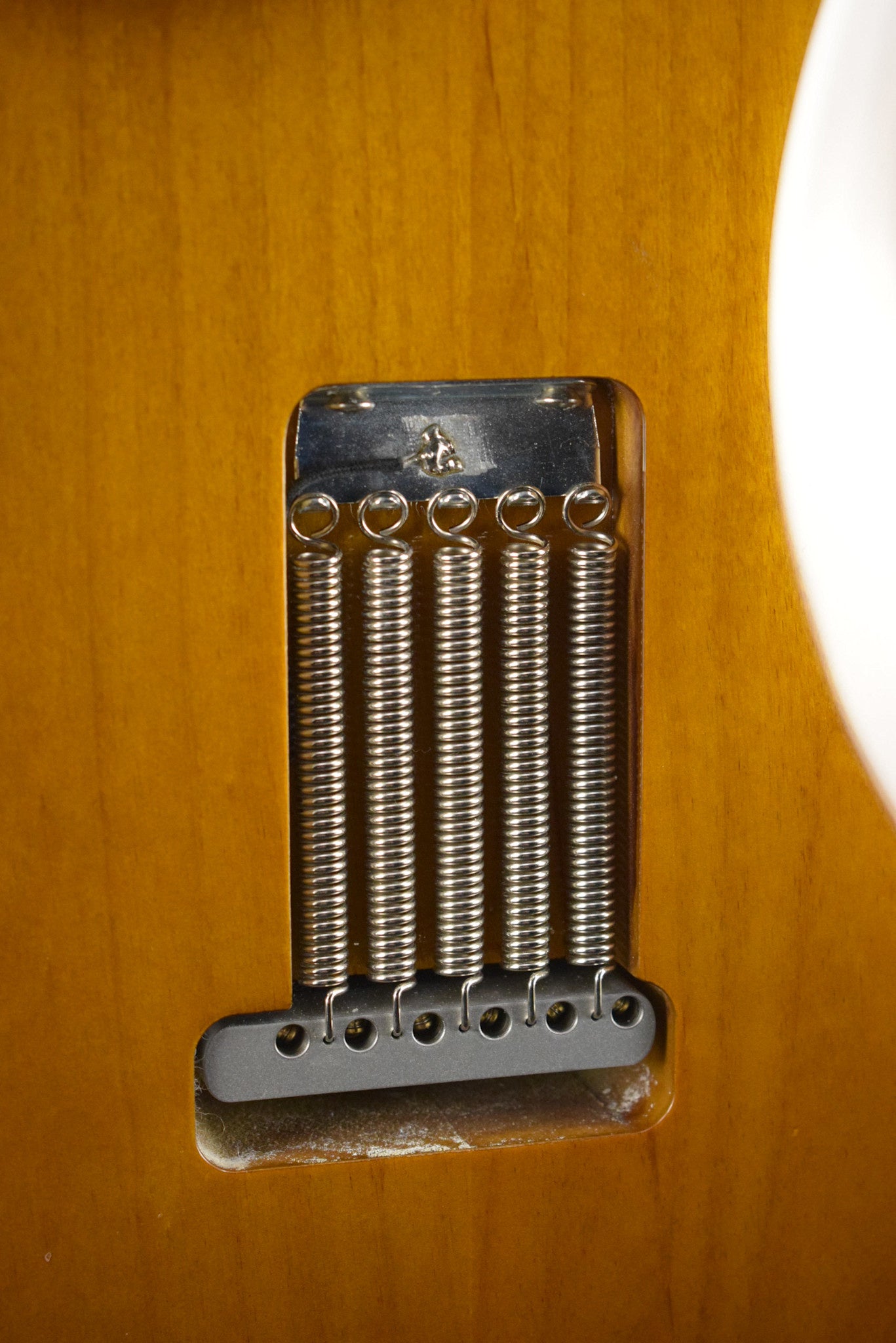 Vintage-style tremolo with silver-painted block,’57-style string recess, no paint between base plate and block, and five springs (no tremolo cover)
