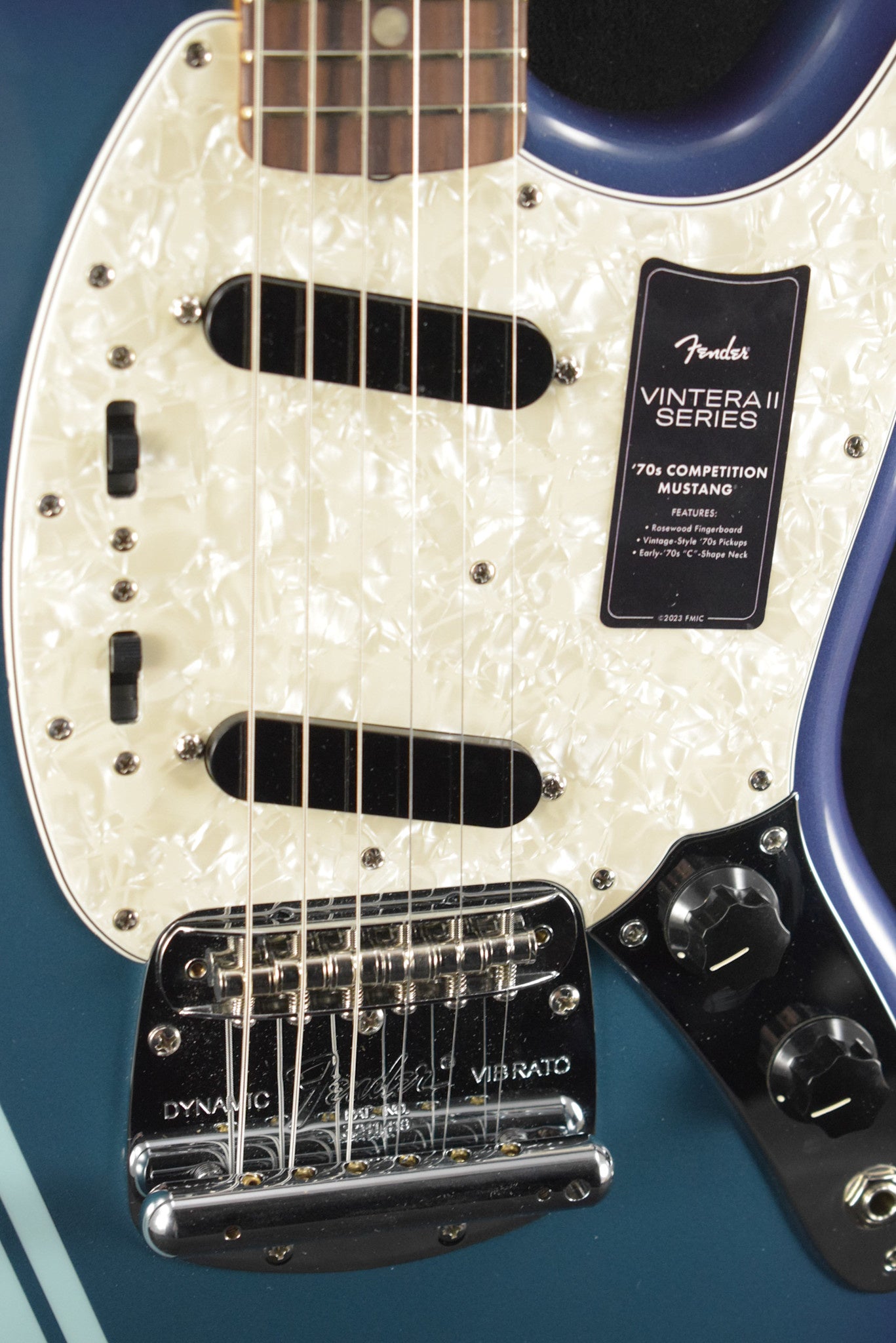 The Vintera® II '70s Competition Mustang® features an alder body and a maple neck with rosewood fingerboard for classic Fender tone that's full of punch and clarity. The early-'70s "C"-shape neck is based on a classic '70s profile for an intuitive and inviting feel, while the 7.25" radius fingerboard with vintage-tall frets provide vintage comfort with ample room for big bends and expressive vibrato. Under the hood, the vintage-style '70s single-coil pickups deliver all the sweet and sparkling, warm and woody tone that made Fender famous. The vintage-style Mustang® "floating" tremolo lets you dive and wail with abandon, while "F"-stamped tuning machines provide classic looks and enhanced tuning stability to complete the package.