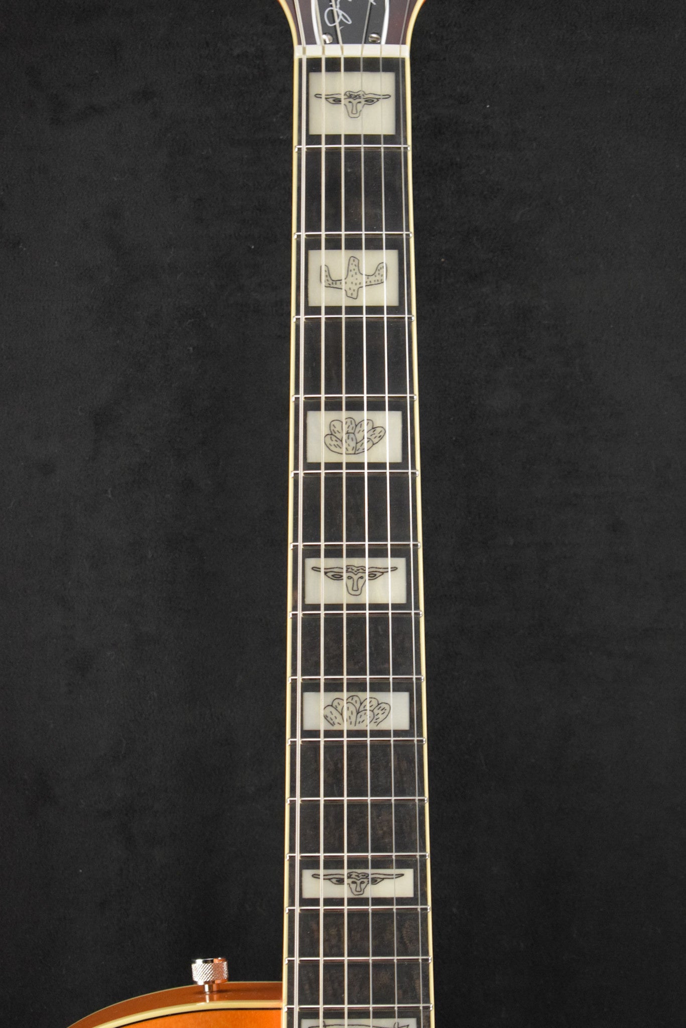 Features include TV Jones® Classic pickups, pinned Adjusto-Matic™ bridge, Gotoh® locking tuners, clear pickguard, “G” body brand, bound oversized F-holes, stained maple headstock overlay, multiple aged body bindings and aged fingerboard and headstock binding. The aged vintage wide-block pearloid inlays feature a western motif of cactus, steer heads and fences, and the headstock features pearloid steer head and Gretsch logo inlays.