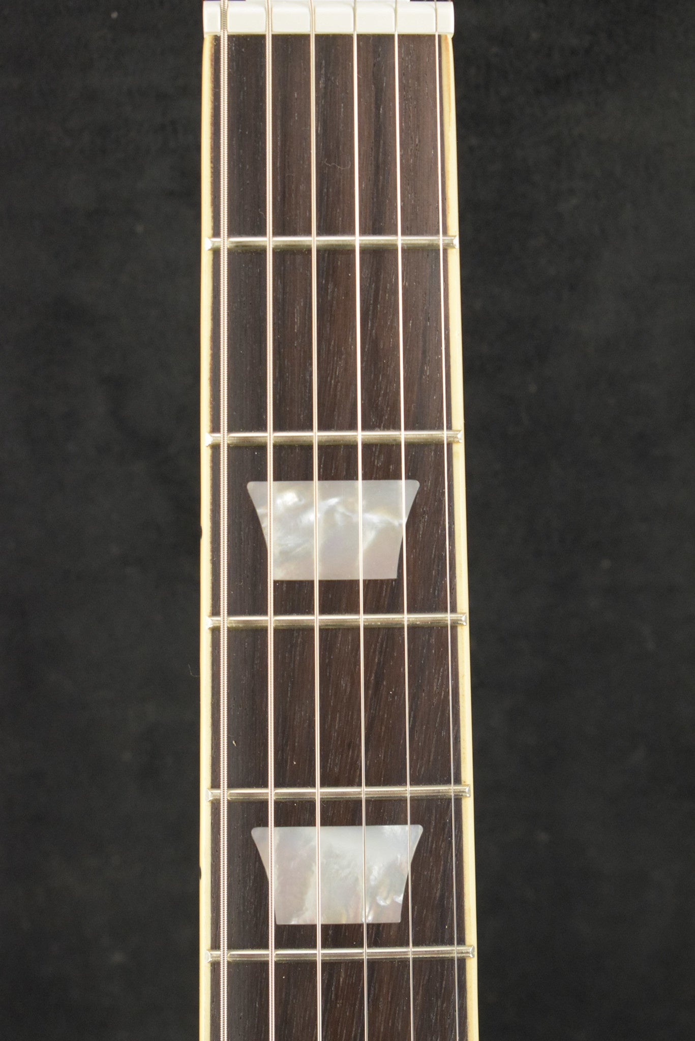 one-piece mahogany neck with a long neck tenon for increased stability and sustain, an authentic 1959 Rounded Medium C neck profile, and a bound rosewood fretboard. It also features mother-of-pearl trapezoid fretboard inlays, an aged mother-of-pearl Epiphone headstock logo, and the words “Les Paul Model” silkscreened in gold on the Gibson-style “open book” headstock. Even the side dot position markers are the same size as on vintage 1959 Les Paul Standard models and are placed in historically accurate locations. The genuine mahogany body features a carved maple cap that is topped with a beautiful AAA flamed maple veneer. The electronics are first class, with two USA Gibson Custombucker humbucking pickups with Alnico 3 magnets that are hand-wired to CTS® potentiometers, Bumblebee paper-in-oil capacitors, and a Switchcraft® pickup selector toggle switch and 1/4” output jack. The Vintage Gloss finish gives the guitar a vintage appearance without looking overly aged and is nicely complimented by the nickel hardware, including the Epiphone Deluxe “Single Ring” Keystone button tuners. A Brown hardshell case with Inspired by Gibson Custom graphics and a pink plush-lined interior is also included. This is the perfect Les Paul for players who love the vintage appeal of the classic 1959 Les Paul Standard but don’t want to mortgage or sell the house to afford one.