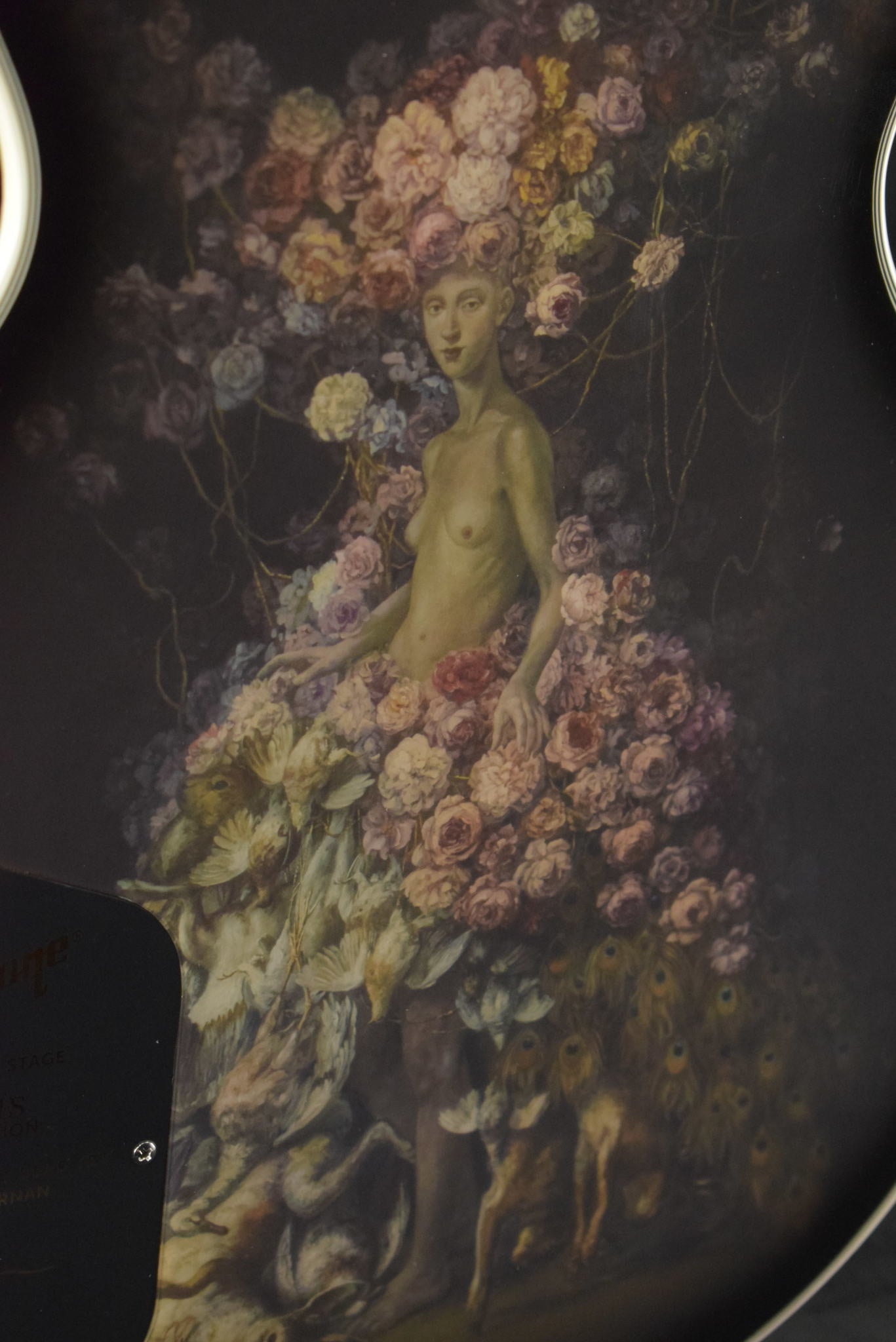 The Epiphone Adam Jones Art Collection consists of seven Silverburst Les Paul™ Custom models, each featuring reproductions of different works of fine art on the back. Adam curated the featured artwork, and additional artwork, designed by artist Korin Faught, adorns the back of the headstock of each model. Five distinguished artists are featured in the collection, and only 800 guitars of each model will be produced. This unprecedented limited-edition collection brings Adam’s love of art and music together.