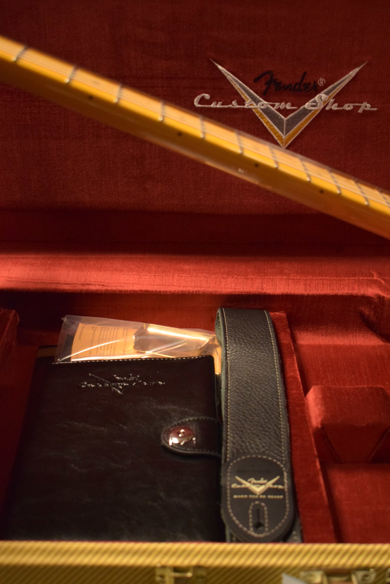 DLX Closet Classic Lacquer Finish; 2-Piece Select Ash Body with Offset Seam; Flat Sawn Maple Neck with 11/56 Off Center "V" Back-Shape; 9.5" (241 mm) Radius; 21 Narrow Tall (6105) Frets; Custom Shop Hand-Wound '55 Single-Coil Strat® Pickups (with RWRP Middle); Fat '50s Strat® Wiring; 5-Way Switch; 1-Ply Eggshell Pickguard; Custom Shop Vintage Synchronized Tremolo; Vintage-Style Tuning Machines with Fender® Logo; Bone Nut; Vintage-Style Disc String Tree; Deluxe Hardshell Case; Strap; Certificate of Authenticity.