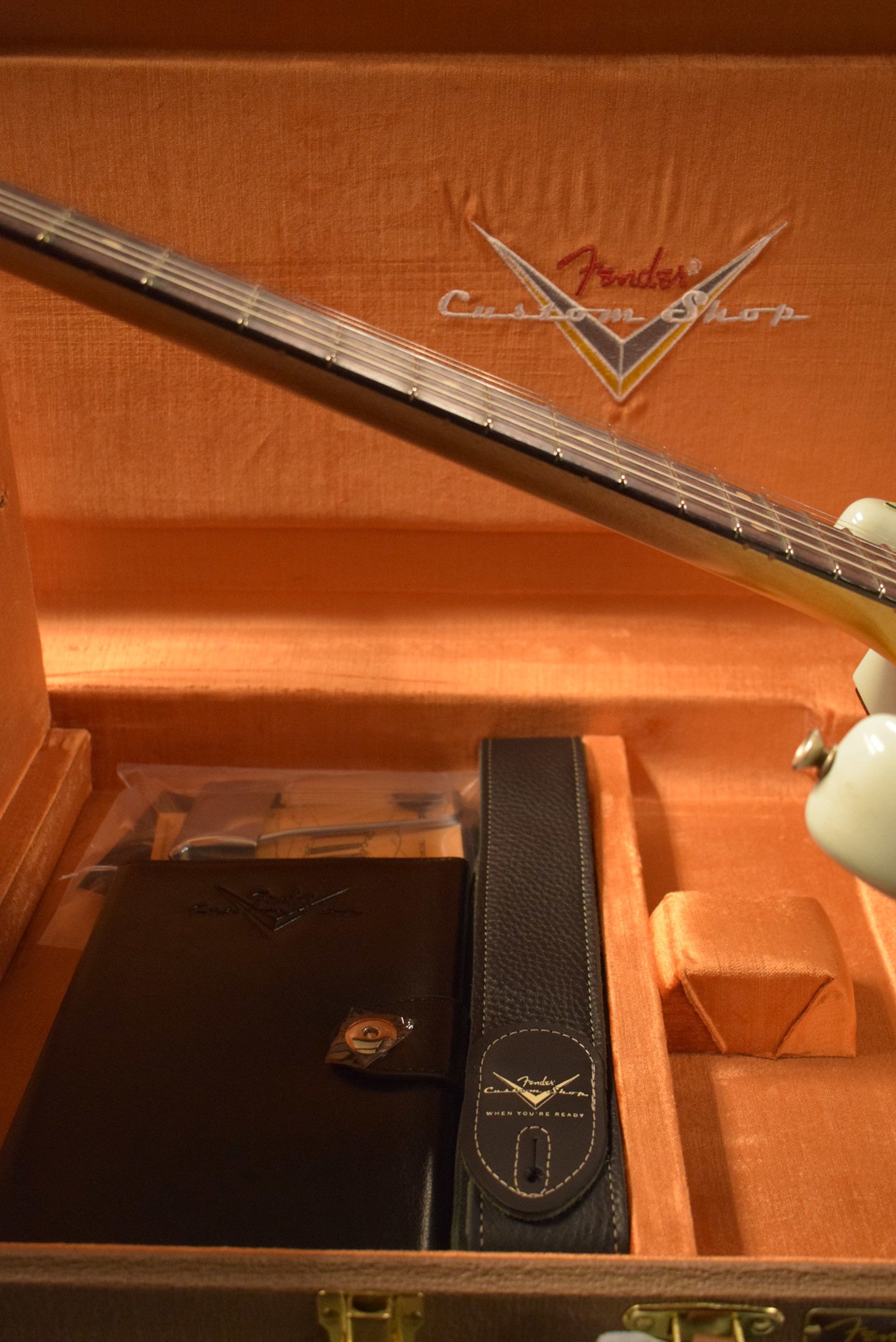 Other premium features include 9.5" radius, 21 narrow tall (6105) frets, 5-way switch, 3-ply mint green pickguard, Custom Shop vintage synchronized tremolo, vintage-style tuning machines, bone nut, wing string tree with tall metal spacer, deluxe hardshell case, strap and certificate of authenticity.