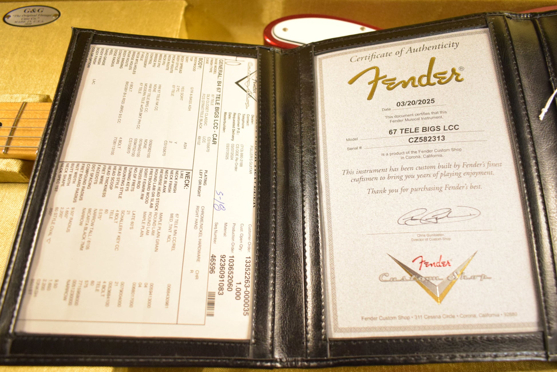 Other premium features include '60-style Oval "C" back-shape, 9.5" radius, 21 narrow tall (6105) frets, Custom Shop hand-wound '67 Tele® pickups, Modern Tele® wiring with Greasebucket™ tone circuit, 3-way switch, 3-ply parchment pickguard, vintage-style "F" tuning machines, bone nut, wing string tree, deluxe hardshell case, strap and certificate of authenticity.