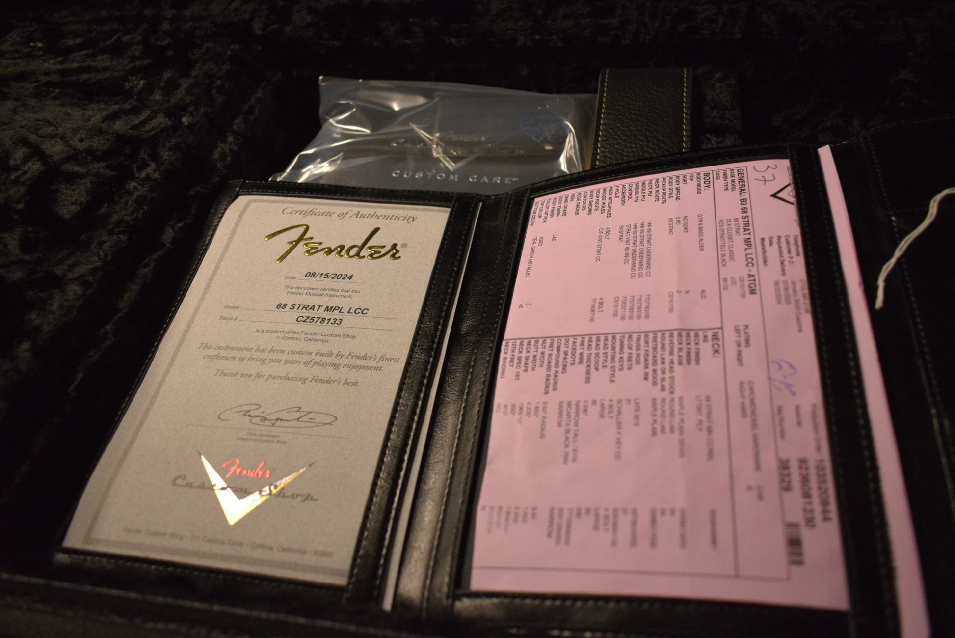 DLX Closet Classic Lacquer/Poly Finish; 2-Piece Select Alder Body; Flat Sawn Maple Neck with Round-Lam Maple Cap; '68-'69 Style "U" Back-Shape; 9.5" Radius; 21 Narrow Tall (6105) Frets; Custom Shop Hand-Wound '69 Underwound Strat® Pickups; Vintage '68-'69 Strat® Wiring; 5-Way Switch; 3-Ply Parchment Pickguard; Custom Shop Vintage Synchronized Tremolo; Schaller® "F" Tuning Machines; Bone Nut; Wing String Tree with Nylon Spacer; Deluxe Hardshell Case; Strap; Certificate of Authenticity.