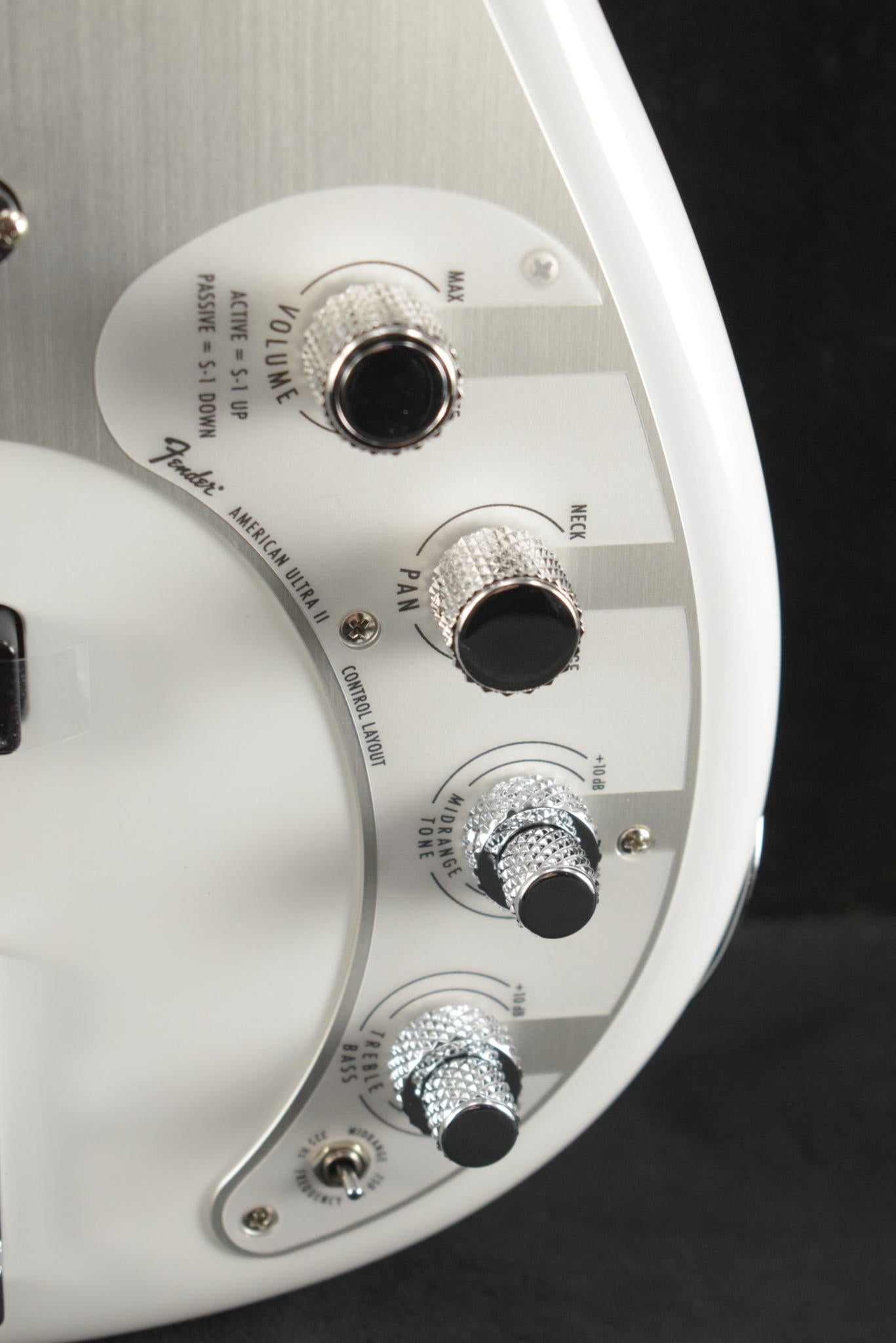 Outfitted with a set of specially designed Ultra II Noiseless™ Vintage pickups, this bass delivers a massive tonal range, from vintage warmth to modern snap, all without a hint of hum. The redesigned preamp features unprecedented control to unlock endless tonal possibilities. Key features include S-1™ switching for active/passive operation, passive tone control and 3-band active EQ with switchable midrange frequency. Additional road-ready features including an adjustable HiMass™ top-load or string-through-body bridge, Fender light-weight tuners with tapered shafts, knurled aluminum knobs and 1-ply anodized aluminum pickguard.