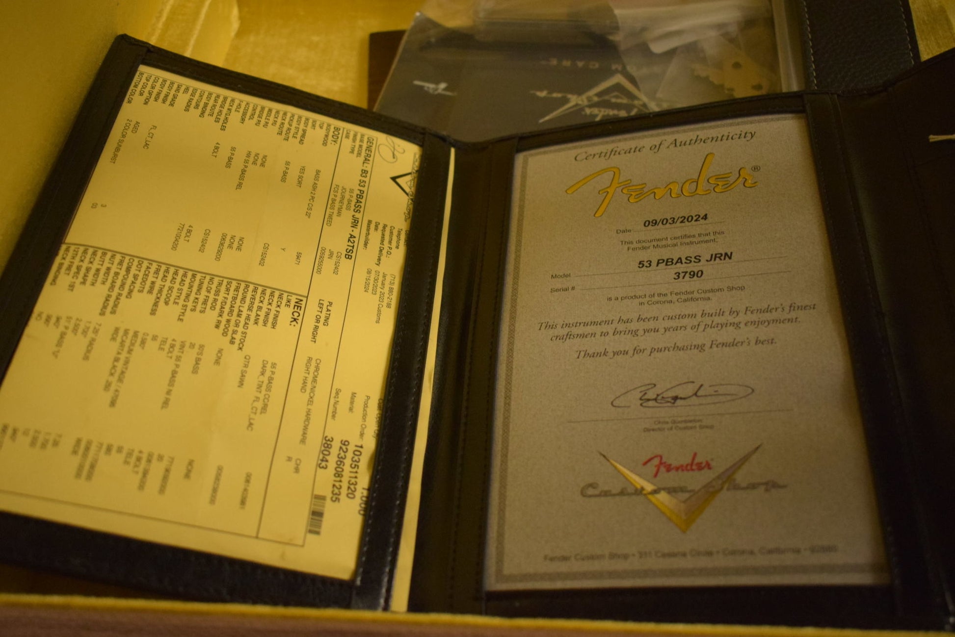 Journeyman Relic® Flash Coat Lacquer Finish; 2-Piece Select Ash Slab Body; Quartersawn Maple Neck with '51 Style "U" Back-Shape; 7.25" Radius; 20 Medium Vintage (47095) Frets; Custom Shop Hand-Wound Vintage P-Bass® Pickup; Vintage Wiring; Single-Ply Black Phenolic Pickguard (Parchment on 2-Color Sunburst and Aged Black); 2-Saddle Vintage-Style Bridge with Fiber Saddles; Vintage-Style Tuning Machines; Bone Nut; Disc String Tree; Deluxe Hardshell Case; Strap; Certificate of Authenticity.