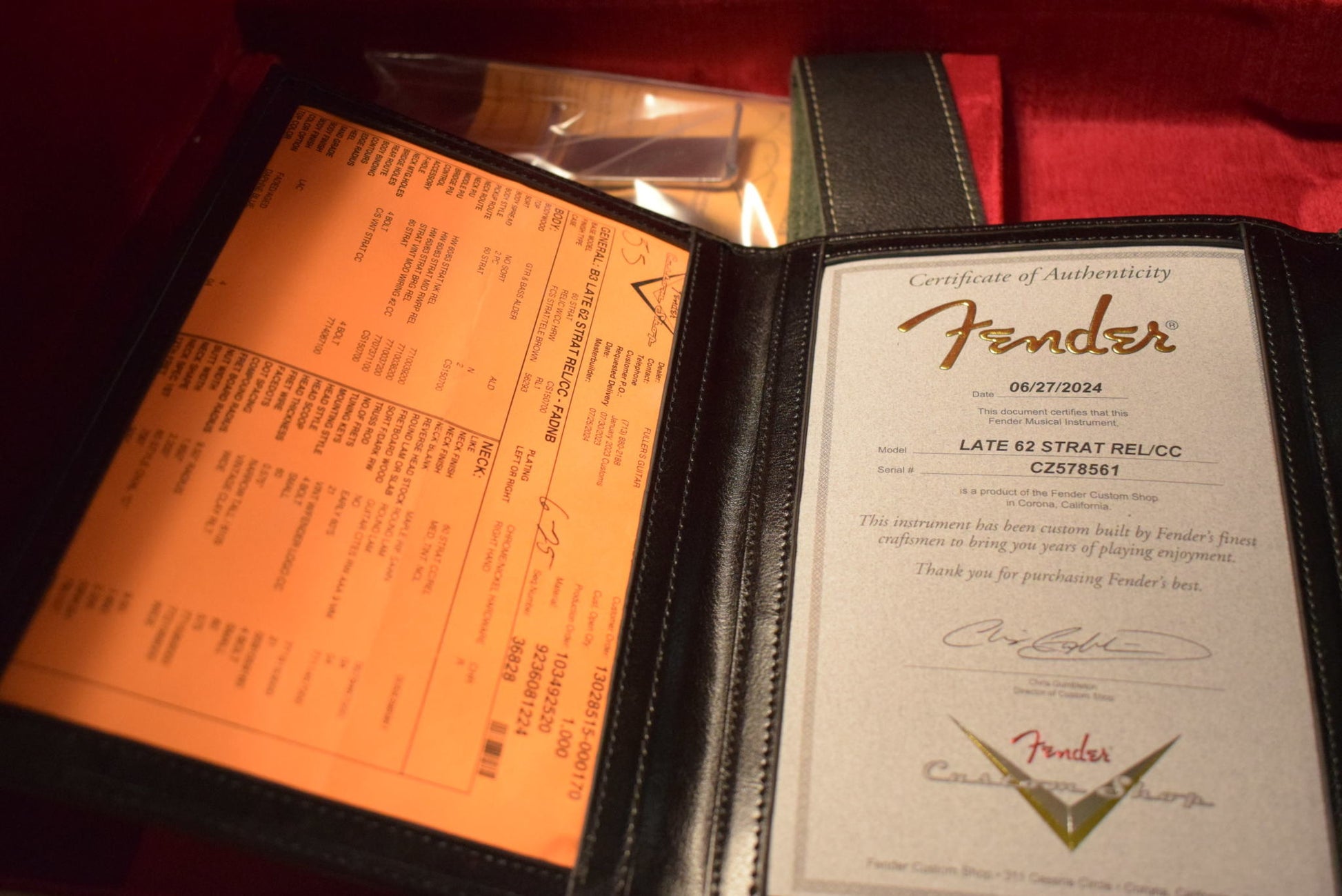 Relic® Lacquer Finish with Closet Classic Hardware; 2-Piece Select Alder Body; Rift Sawn Maple Neck with Round-Lam Rosewood Fingerboard; '60 Style Oval "C" Back-Shape; 9.5" Radius; 21 Narrow Tall (6105) Frets; Custom Shop Hand-Wound '60/'63 Strat® Pickups with RWRP Middle; Vintage Modified #2 Wiring with Tone-Saver Bleed; 5-Way Switch; 3-Ply Mint Green Pickguard; Custom Shop Vintage Synchronized Tremolo; Vintage-Style Tuning Machines; Bone Nut; Wing String Tree with Tall Metal Spacer; Deluxe Hardshell Case; Strap; Certificate of Authenticity.