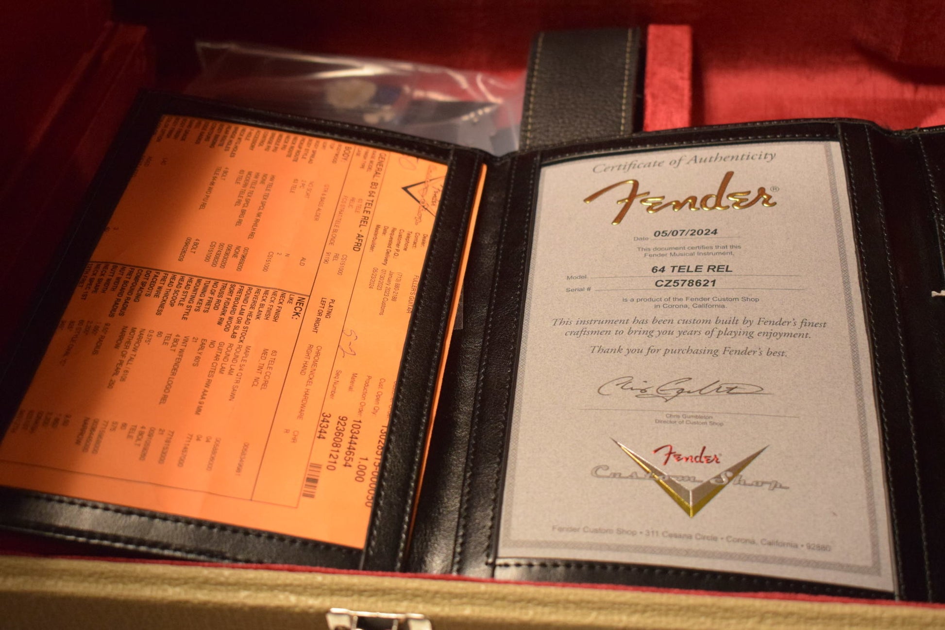 'Relic® Lacquer Finish; 2-Piece Select Alder Body (Ash on Natural Blonde); Quartersawn Maple Neck with Round-Lam Rosewood Fingerboard; '60 Style Oval "C" Back-Shape; 9.5" Radius; 21 Narrow Tall (6105) Frets; Custom Shop Hand-Wound Texas Special™ Tele® Pickups; Modern Tele® Wiring; 3-Way Switch; 3-Ply Mint Green Pickguard; '64-'66 Tele® Bridge with Threaded Steel Saddles; Vintage-Style Tuning Machines; Bone Nut; Wing String Tree; Deluxe Hardshell Case; Strap; Certificate of Authenticity.