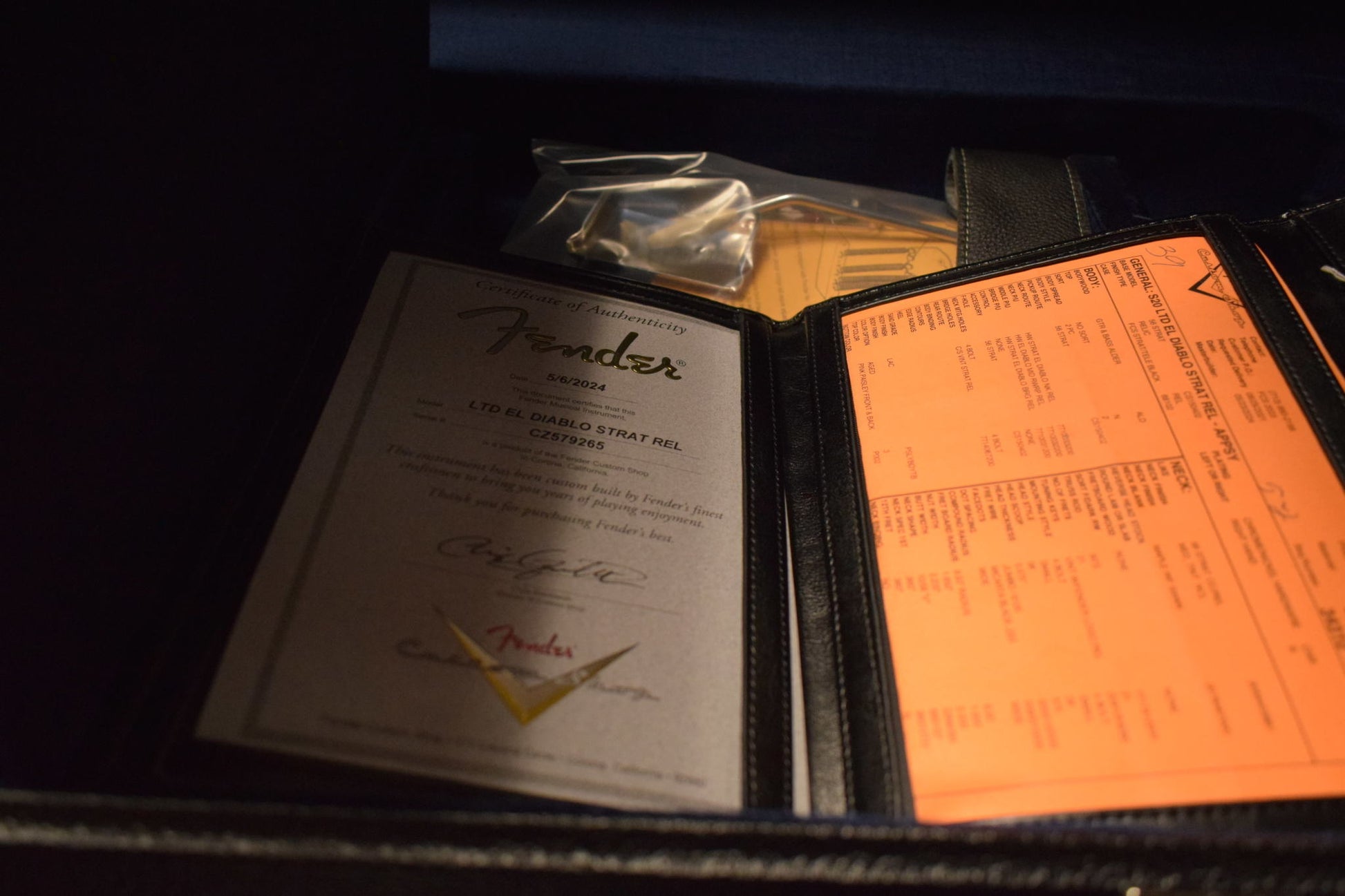 Relic® Lacquer Finish; 2-Piece Select Alder Body; 1-Piece Rift Sawn Maple Neck with 10/56 "V" Back-Shape; 9.5" Radius; 21 Jumbo (6100) Frets; Hand-Wound El Diablo Strat® Pickups with RWRP Middle; Vintage Modified #2 Wiring with Tone-Saver Bleed; 5-Way Switch; Raw Aluminum Pickguard & Back Plate; Custom Shop Vintage Synchronized Tremolo; Vintage-Style Tuning Machines; Bone Nut; Wing String Tree; Deluxe Hardshell Case; Strap; Certificate of Authenticity.