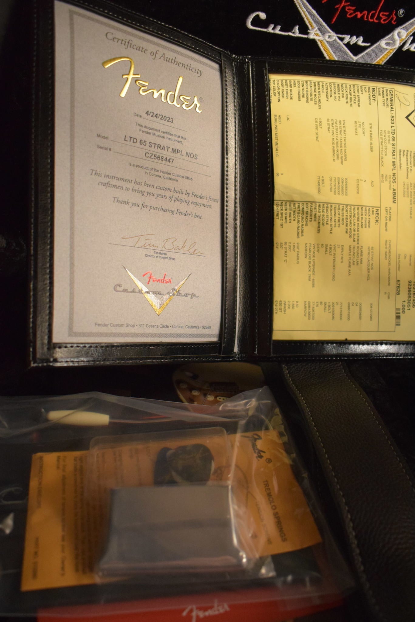 NOS Lacquer Finish; 2-Piece Select Alder Body; 3A Flame Maple Neck with '65 Style "C" Back-Shape; Round-Lam 3A Flame Maple Fingerboard; 9.5" Radius; 21 Vintage-Style (45085) Frets; Custom Shop Hand-Wound Fat '60s Strat Pickups with RWRP Middle; Vintage Modified #2 Wiring with Tone-Saver Bleed; 5-Way Switch; 3-Ply Parchment Pickguard; Custom Shop Vintage Synchronized Tremolo; Vintage-Style Tuning Machines; Bone Nut; Wing String Tree with Nylon Spacer; Deluxe Hardshell Case; Strap; Certificate of Authenticity.