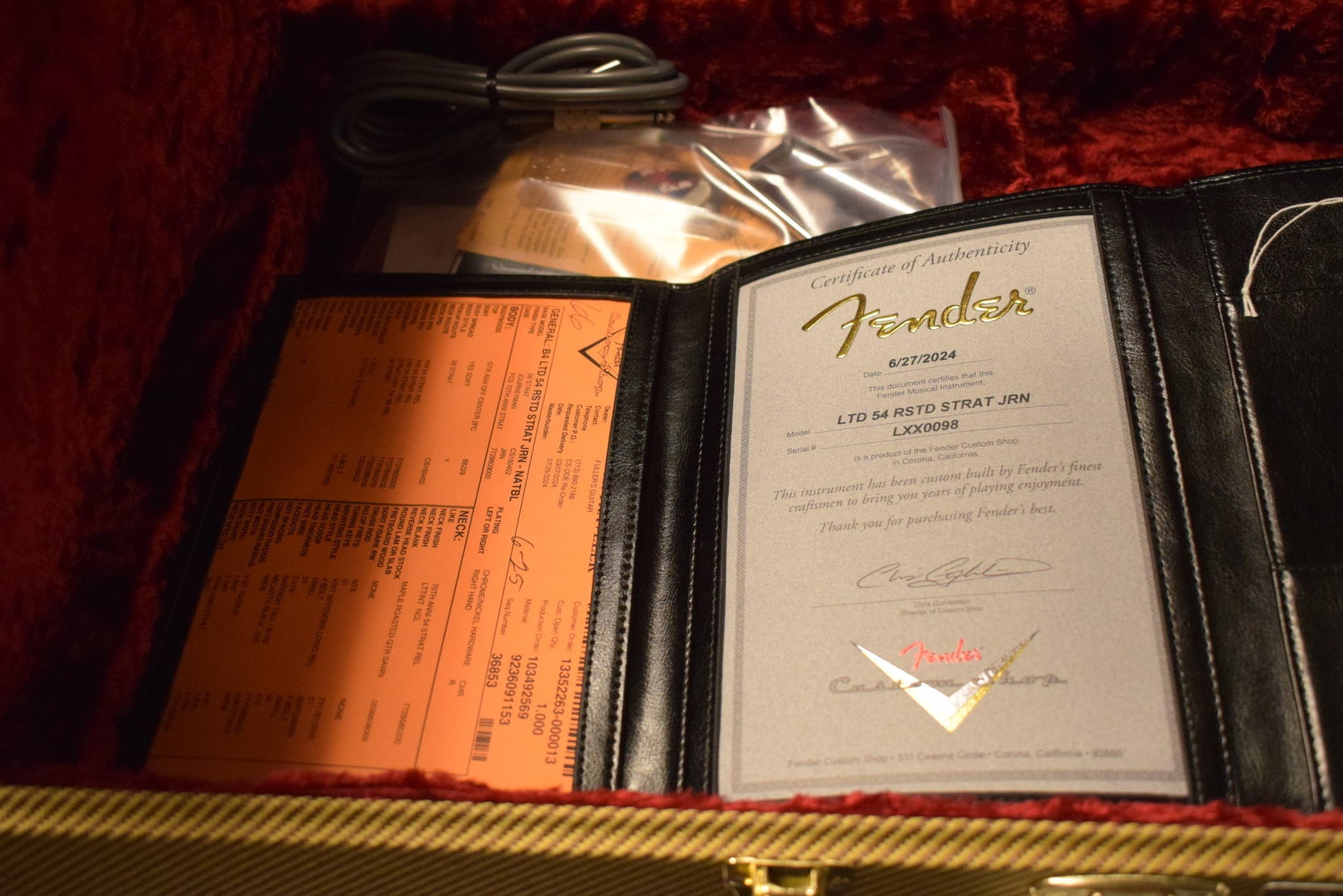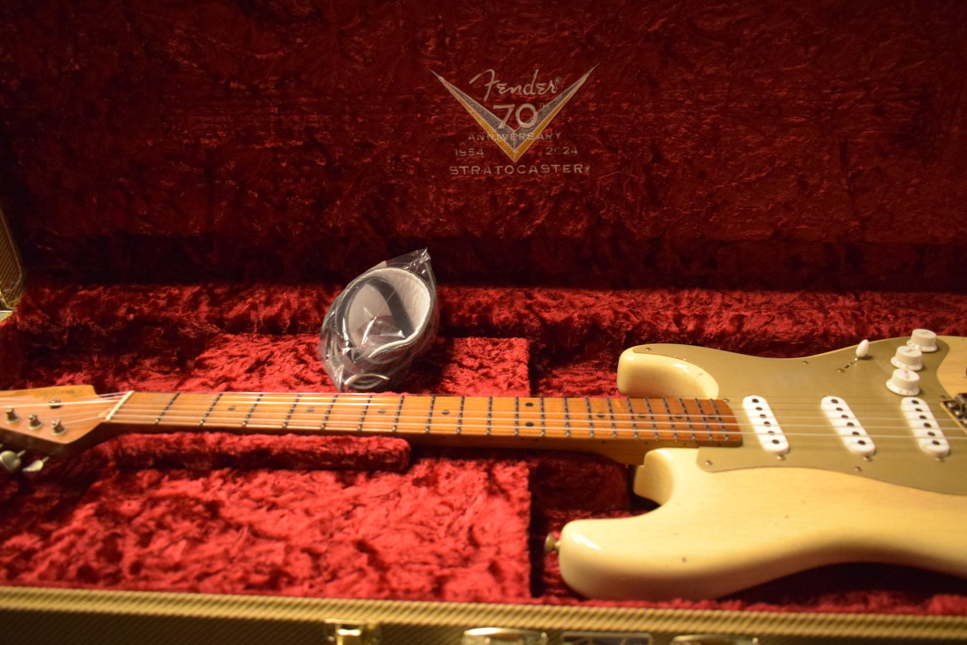 The one-piece roasted quartersawn maple neck is fashioned with a special 70th anniversary Soft “V” profile based on an incredible Strat® neck from July 1954, topped by a 9.5”-radius fingerboard with 21 narrow tall (6105) frets and a 1.625” bone nut. Three Custom Shop hand-wound ’54 Strat® pickups deliver that classic Strat® voice with clear, bell-like highs, routed through vintage '54 Strat® wiring with wax paper cap and five-way switching.