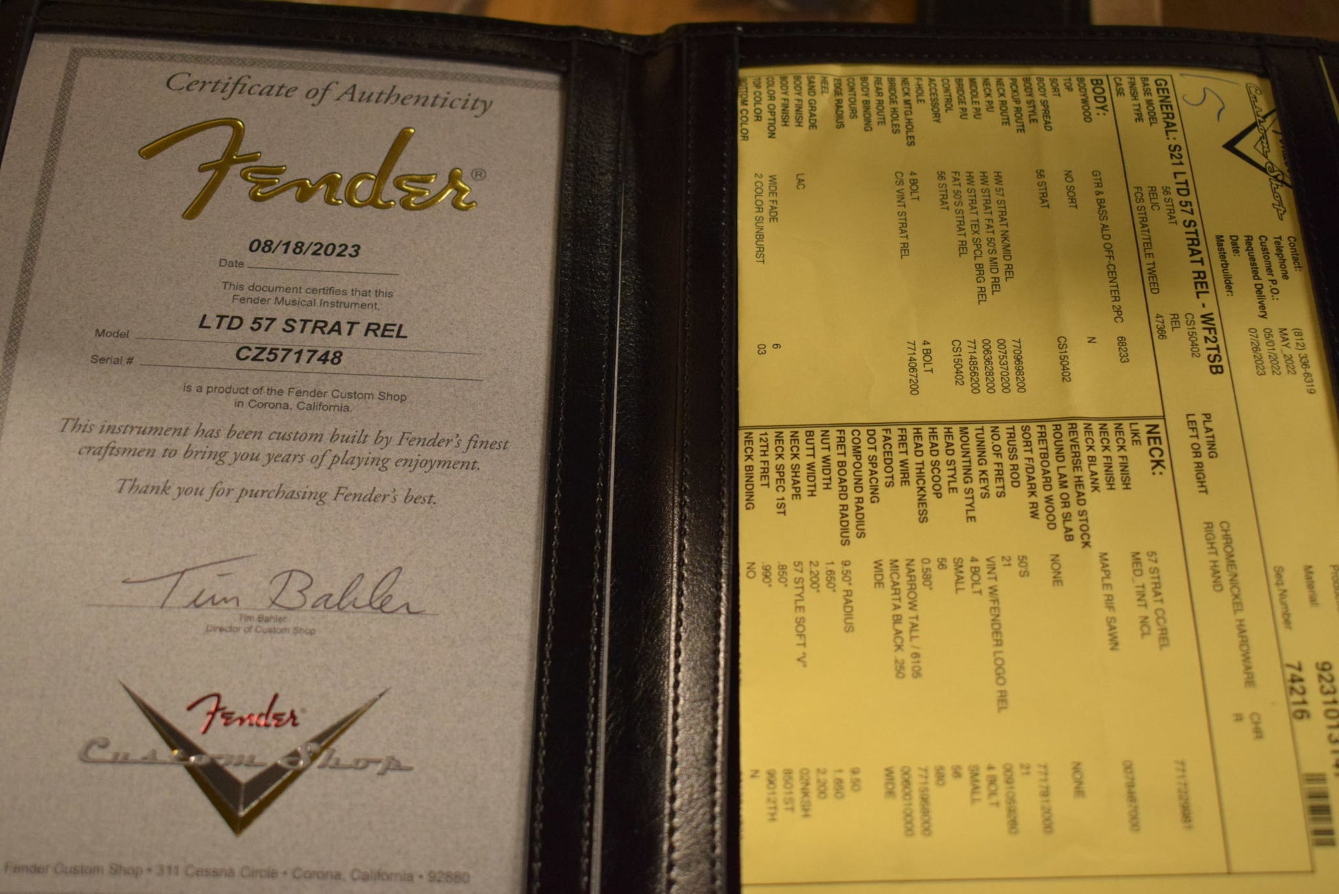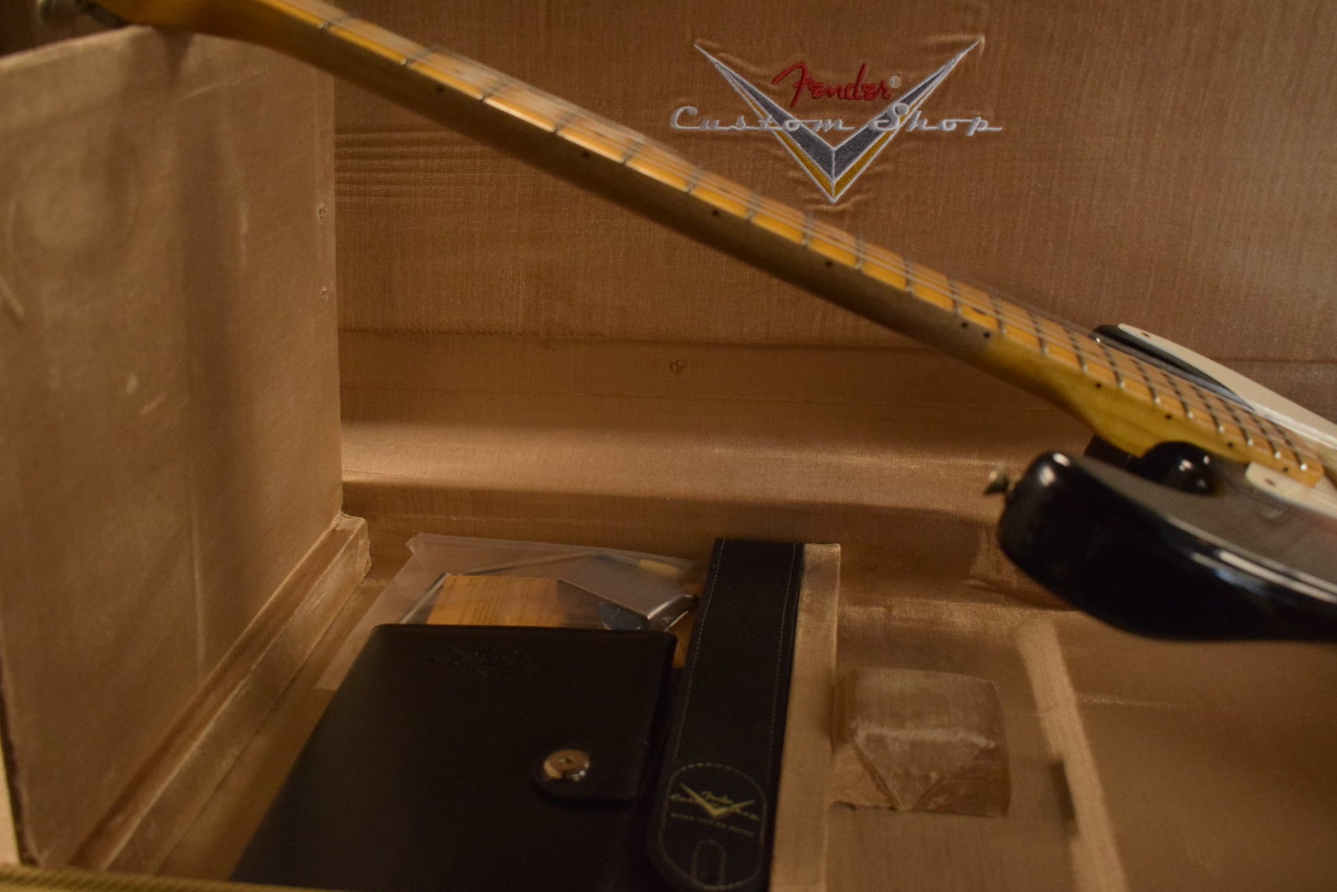 Relic® Lacquer Finish; 2-Piece Off-Center Seam Alder Body; 1-Piece Rift Sawn Maple Neck with '57 Style Soft "V" Back-Shape; 9.5" Radius; 21 Narrow Tall (6105) Frets; Hand-Wound Texas Special™ (Bridge); Hand-Wound Fat '50s RWRP (Middle), and Hand-Wound '57 Strat® (Neck) Pickups; Fat 50's Strat® Wiring; 5-Way Switch; Single-Ply Parchment Pickguard; Custom Shop Vintage Synchronized Tremolo; Vintage-Style Tuning Machines; Bone Nut; Wing String Tree; Deluxe Hardshell Case; Strap; Certificate of Authenticity.