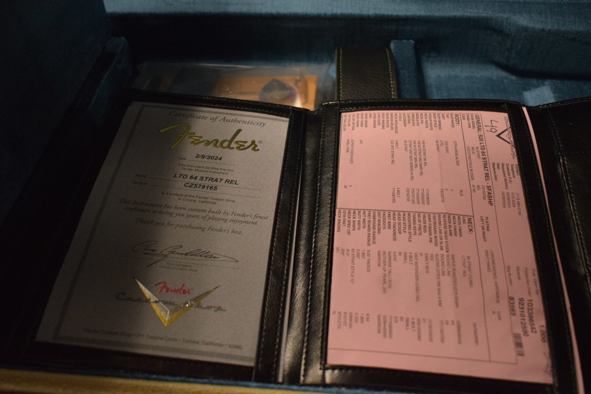 Relic® Lacquer Finish; 2-Piece Select Alder Body; Roasted Quartersawn Maple Neck with Round-Lam Rosewood Fingerboard; '63 "C" Back-Shape; 9.5" Radius; 21 Narrow Tall (6105) Frets; Hand-Wound '64 Strat® Pickups with RWRP Middle; Vintage Modified #2 Wiring with Tone-Saver Bleed; 5-Way Switch; 3-Ply Parchment Pickguard; Custom Shop Vintage Synchronized Tremolo; Vintage-Style Tuning Machines; Bone Nut; Wing String Tree with Tall Metal Spacer; Deluxe Hardshell Case; Strap; Certificate of Authenticity.