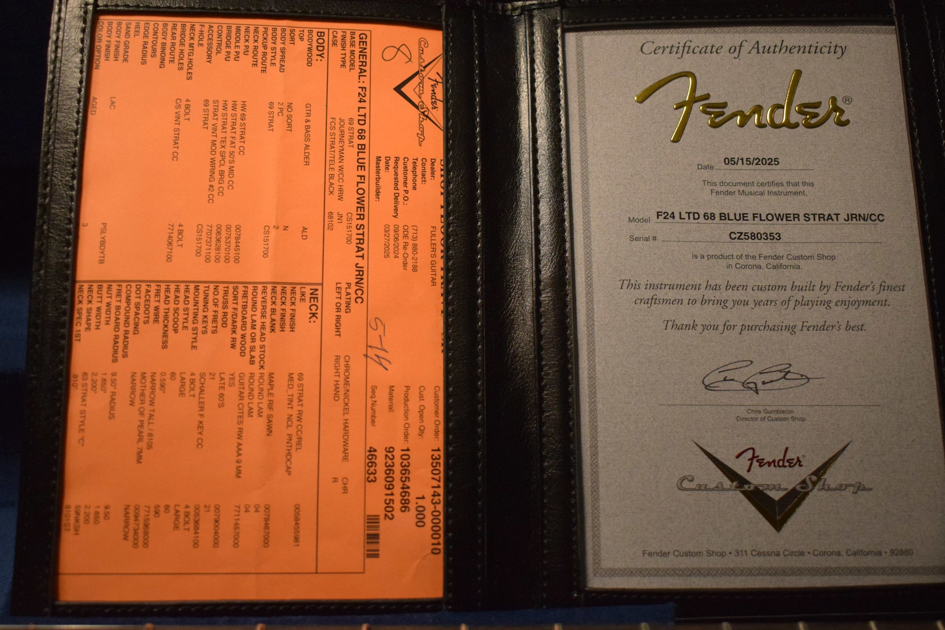 Limited Edition '68 Stratocaster® Journeyman Relic® with Closet Classic Hardware, 3A Rosewood Fingerboard, Blue Flower Team Built Custom Relic® Lacquer Finish; 2-Piece Select Alder Body; Rift Sawn Maple Neck with 1969 "U" Back-Shape; Round-Laminated Rift Sawn Maple Fingerboard; 9.5" (241 mm) Radius; 21 Narrow Tall (6105) Frets; Custom Shop Hand-Wound Texas Special™ Single-Coil Strat® Bridge Pickup, Custom Shop Hand-Wound RWRP Fat '50s Single-Coil Strat® Middle Pickup, Custom Shop Hand-Wound '69 Single-Coil Strat® Neck Pickup; Strat® Wiring with 1/2 Blender and Tone Saver; 5-Way Switch; 3-Ply Parchment Pickguard; 6-Saddle Vintage-Style Synchronized Tremolo with Bent Steel Saddles; Fender®/Schaller® Vintage “F” Style Tuning Machines; Bone Nut; American Vintage '65 String Tree; Deluxe Hardshell Case; Strap; Certificate of Authenticity.