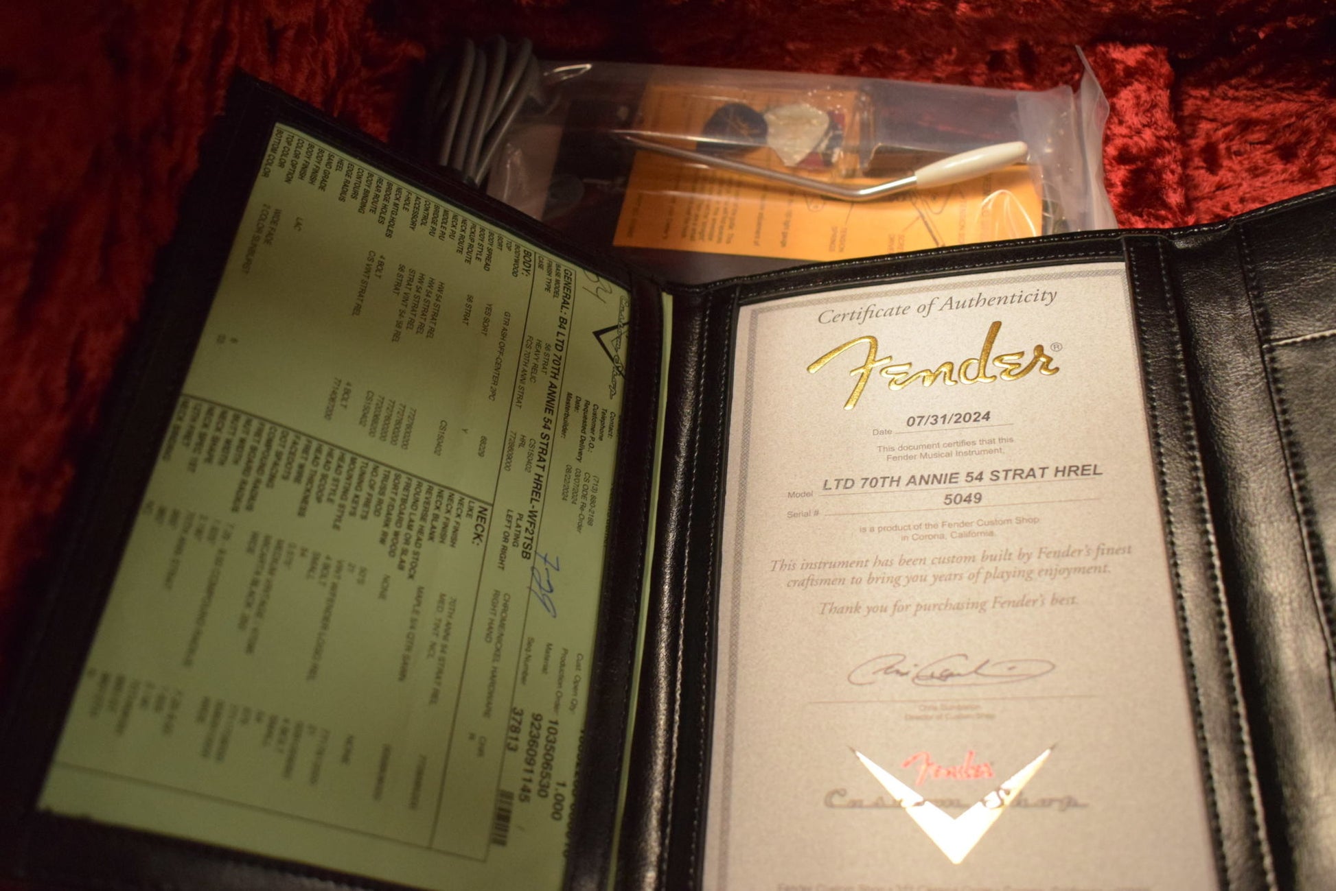 Other premium features and authentic first-year Strat® appointments include a single-ply white pickguard and serial-number back plate, 1954-style ABS white pickup covers and control knobs, Custom Shop vintage synchronized tremolo bridge, vintage-style tuners, disc string tree, special 70th Anniversary Stratocaster® neck plate, deluxe embroidered hardshell case, special “case candy” kit and certificate of authenticity.