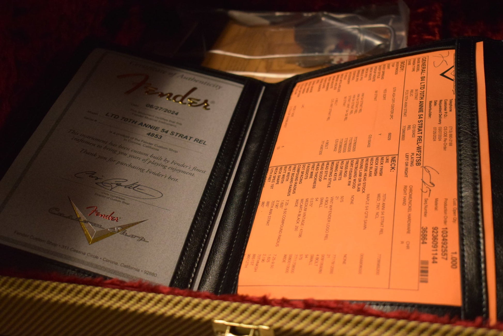 Other premium features and authentic first-year Strat® appointments include a single-ply white pickguard and serial-number back plate, 1954-style ABS white pickup covers and control knobs, Custom Shop vintage synchronized tremolo bridge, vintage-style tuners, disc string tree, special 70th Anniversary Stratocaster® neck plate, deluxe embroidered hardshell case, special “case candy” kit and certificate of authenticity.