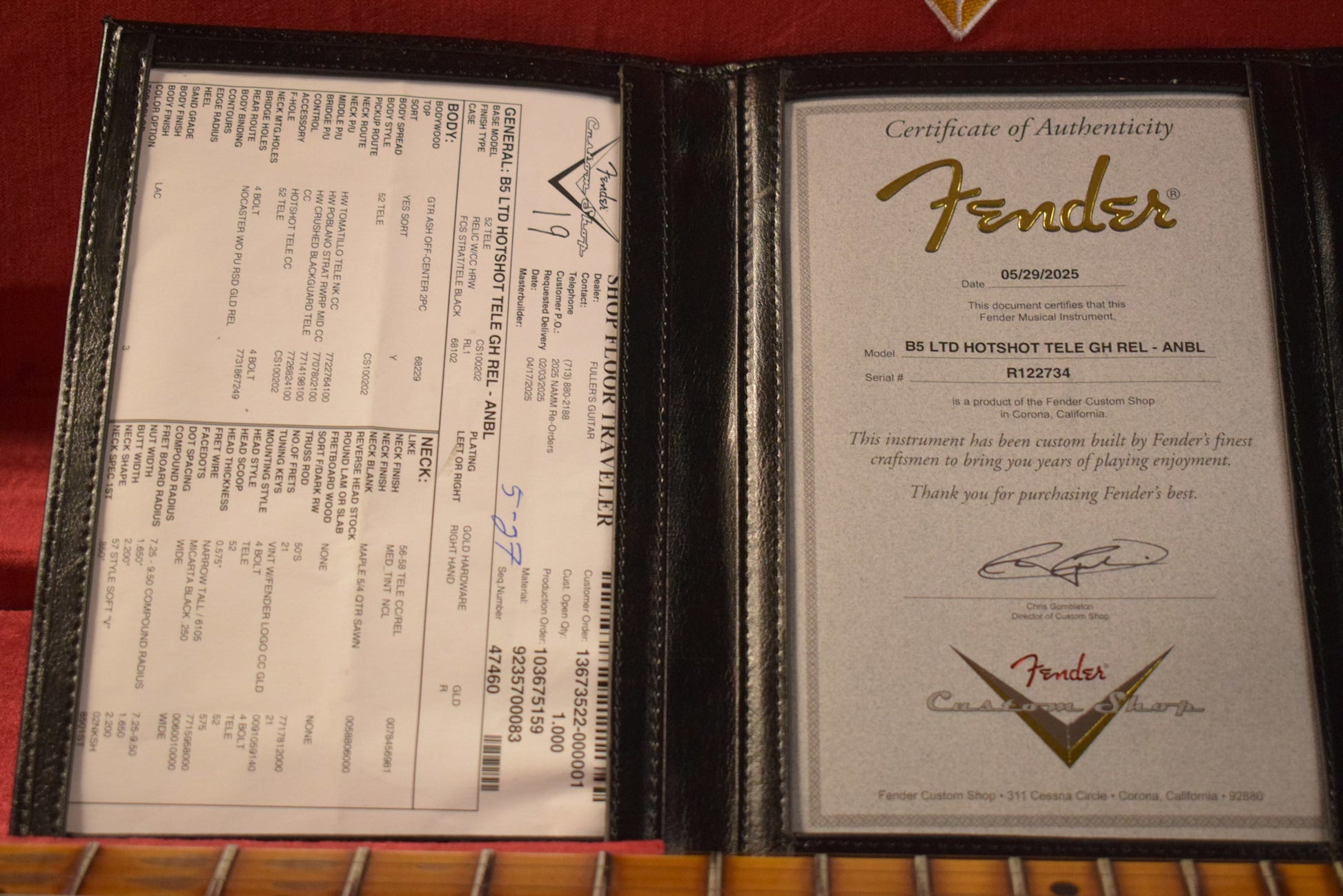 Other premium features include a 7.25" to 9.5" Vintage Compound Radius, Hotshot™ Tele® Wiring, 1-Ply Parchment Pickguard, 3-Saddle '51 Nocaster® with Brass Saddles, Vintage-Style Tuning Machines with Fender® Logo, Bone Nut, American Vintage '56-'58 String Tree, Deluxe Hardshell Case, Strap, Certificate of Authenticity.