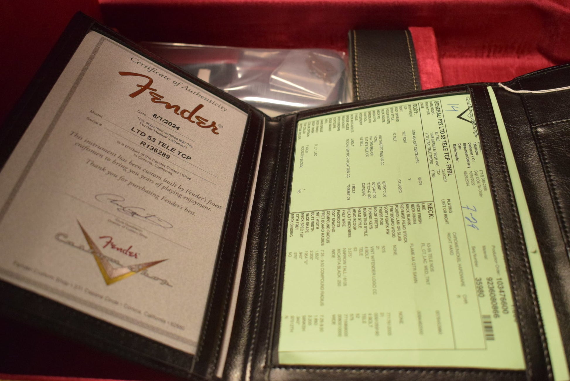 Flash Coat Lacquer Finish with Closet Classic Hardware; 2-Piece Select Off-Center Seam Ash Body; 1-Piece 2A Flame Quartersawn Maple Neck with '54 Style "U" Back-Shape; 7.25" to 9.5" Vintage Compound Radius; 21 Narrow Tall (6105) Frets; Custom Shop Hand-Wound "OBG" Original Blackguard Tele® (Bridge), and Twisted Tele® (Neck) Pickups; Fat '50s Tele® Wiring; 3-Way Switch; Single-Ply Black Phenolic Pickguard; Vintage-Style Nocaster® Bridge with Compensated Brass Barrel Saddles; Vintage-Style Tuning Machines; Bone Nut; Disc String Tree; Deluxe Hardshell Case; Strap; Certificate of Authenticity.