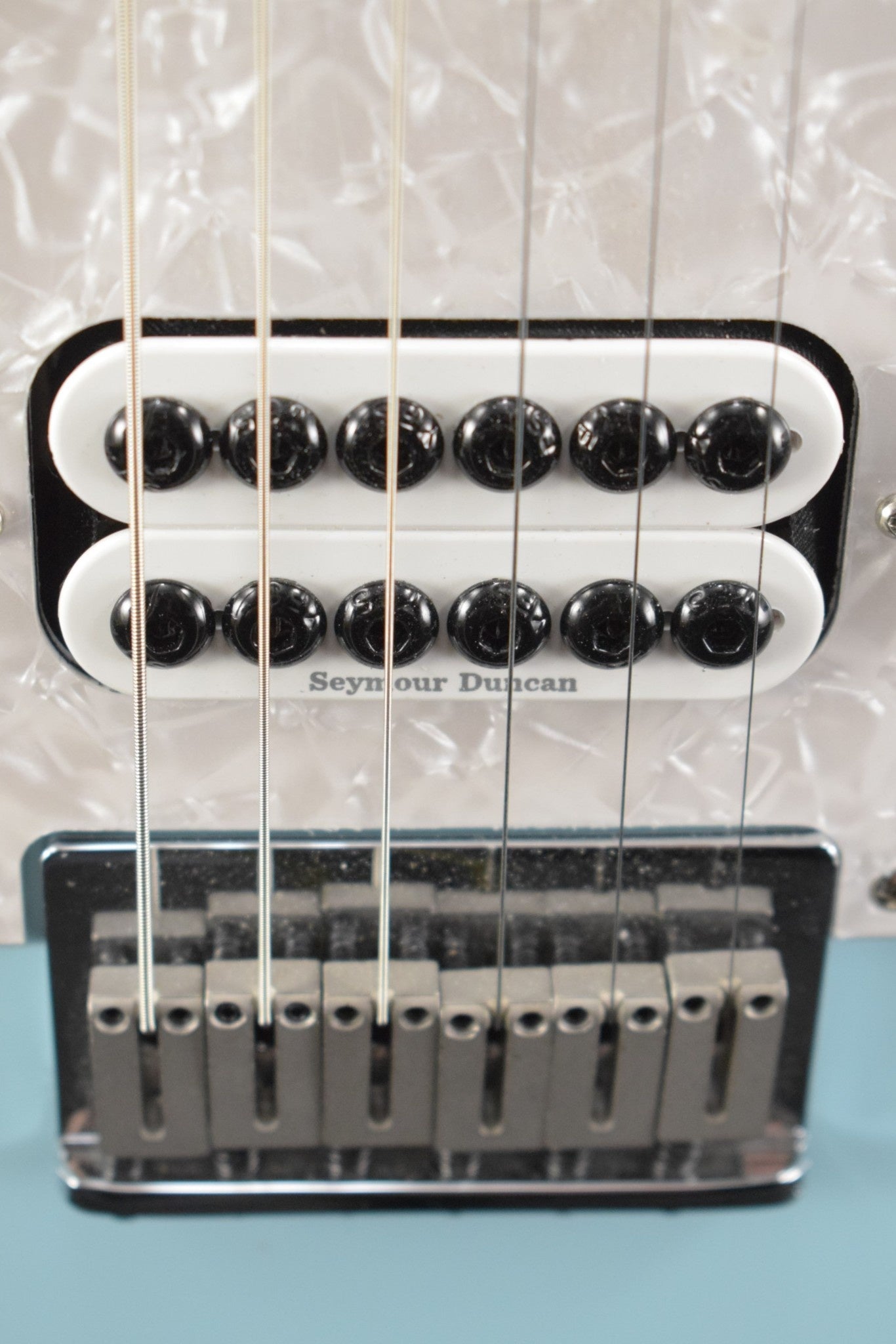 The Tom DeLonge Stratocaster boasts a Seymour Duncan® Invader™ humbucker for immense output and turbo-charged tone that's perfect for chunky power chords and crunchy riffs. But it's not all about power - the streamlined control setup consisting of a single master volume combined with a treble bleed circuit preserves the guitar's natural high-end, ensuring sparkly cleans and chime-y edge-of-breakup tones. The comfy modern "C" neck features medium jumbo frets on a 9.5" radius rosewood fingerboard for a modern feel with superior playability. Other highlights include vintage-style tuners and hardtail Stratocaster bridge with block saddles for classic looks, superior intonation and enhanced tuning stability. A custom crafted Tom DeLonge neck plate is decorated with DeLonge's original artwork.
