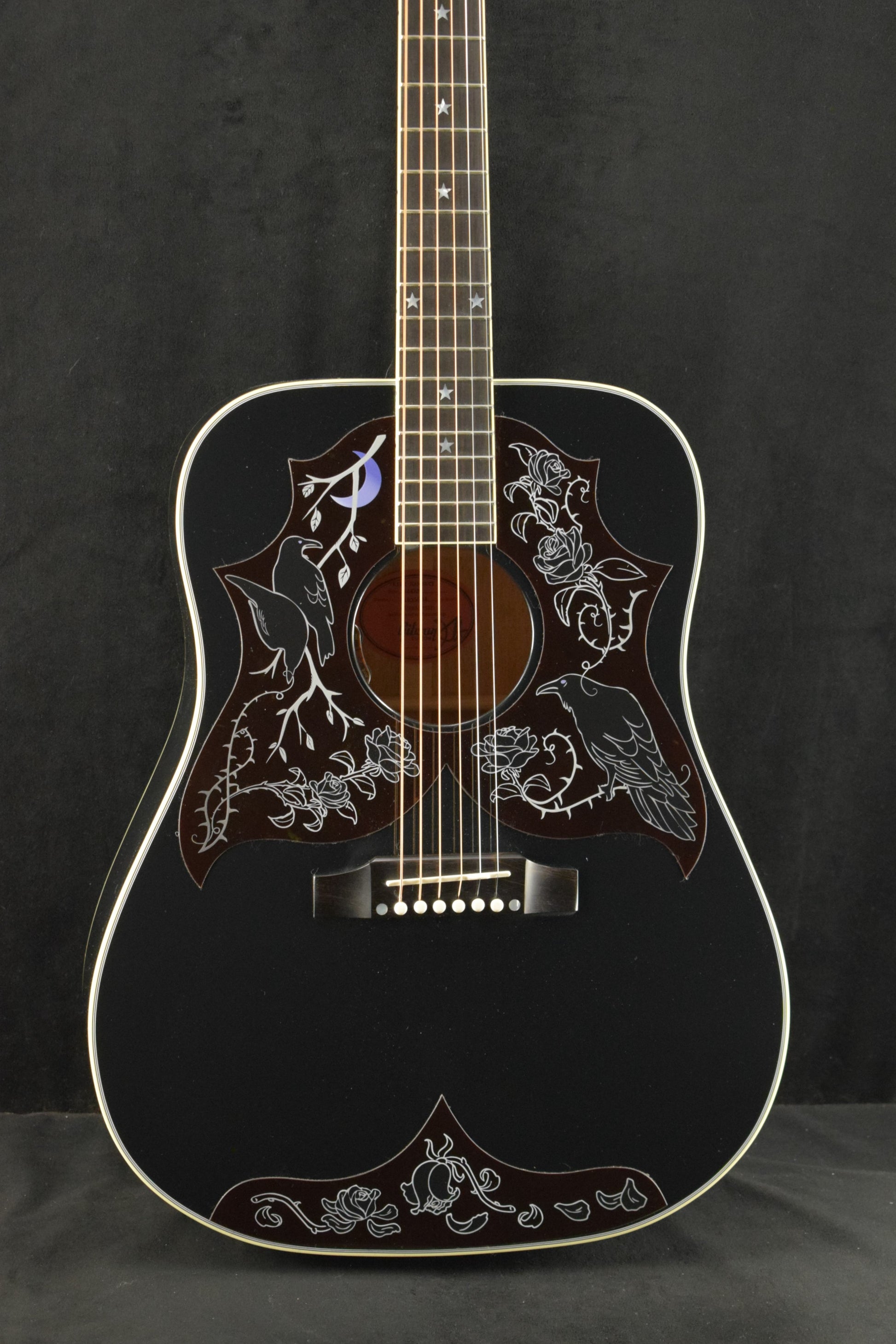 Features a Sitka spruce top, mahogany body, ebony fretboard with star inlays, and mother-of-pearl raven skull headstock detail, and is crafted with care by Gibson Custom.