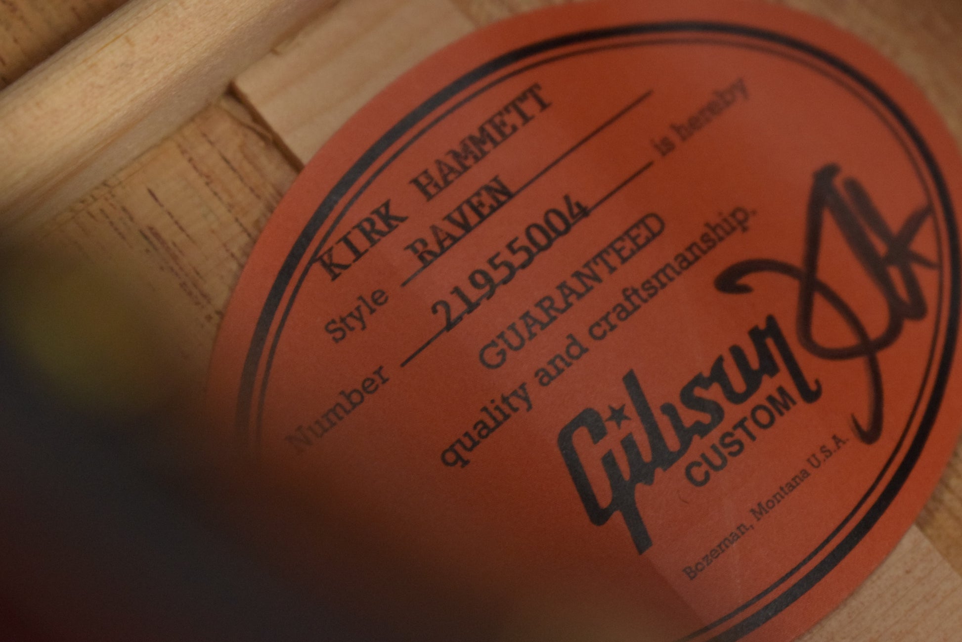Sound hole label signed by Kirk Hammett