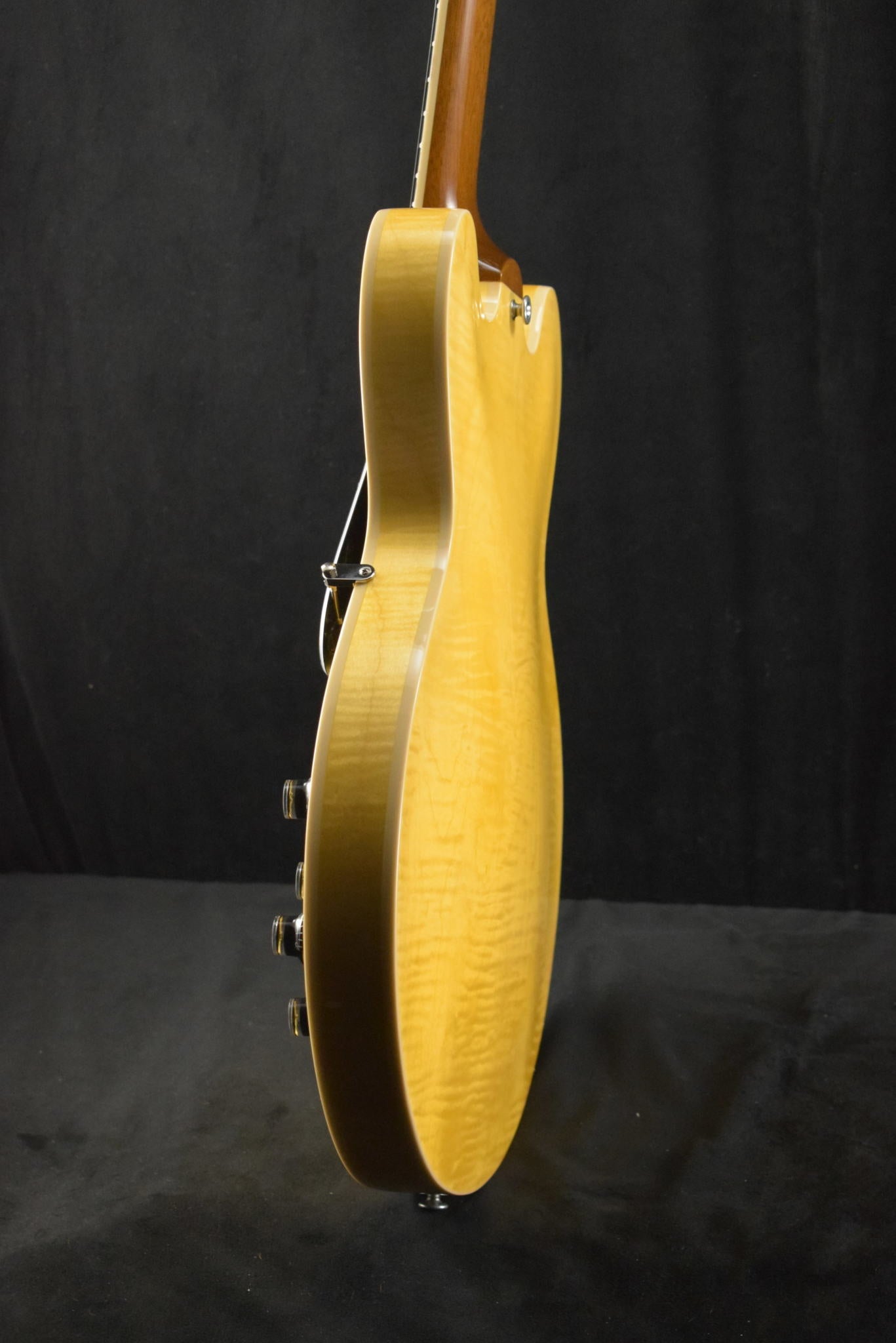 The Gibson ES-335 Figured is the perfect blend of form and function. Crafted with a maple centerblock and quarter-sawn Adirondack spruce bracing, players will be impressed by the lightweight feel and expanded range of tonal capabilities. Equipped with high-end appointments like our hand-wired control assembly with Orange Drop® capacitors, Gibson's new Calibrated T-Type humbucking pickups, Vintage Deluxe style tuners and light weight aluminum ABR-1 bridge and Stop Bar tailpiece anchored with steel thumb-wheels and studs. The AAA figured maple is set off by a staggering gloss finish.