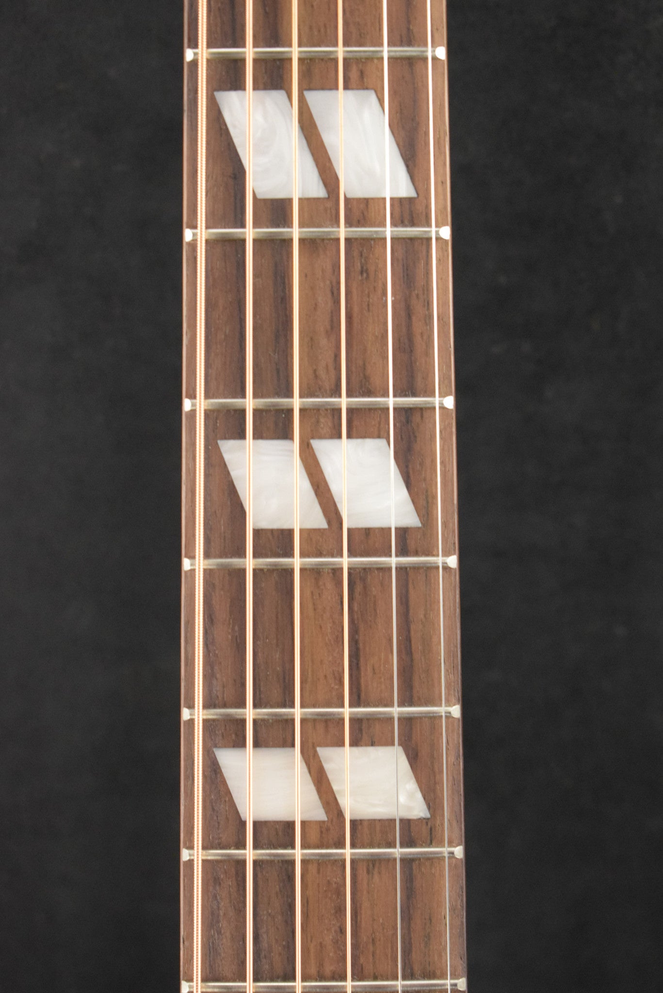 Solid mahogany square shoulder body, solid Sitka spruce top, Round profile utile neck, rosewood fretboard with 20 standard frets and pearloid parallelogram inlays, satin nitrocellulose lacquer finish, L.R. Baggs electronics, premium soft shell case