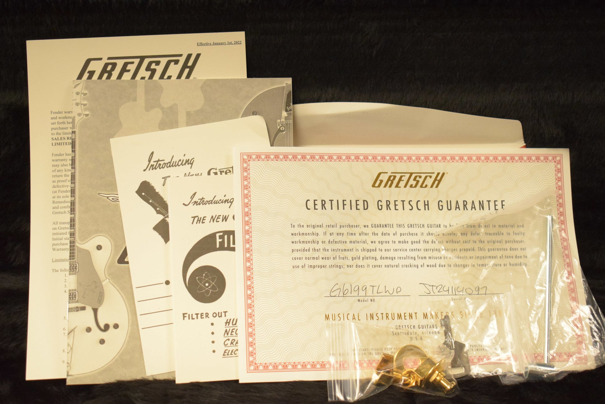 Included in the case is a certificate of authenticity, gold strap locks, truss rod tool, case key, Gretsch OK card, warranty card, and Gretsch guitar guide.
