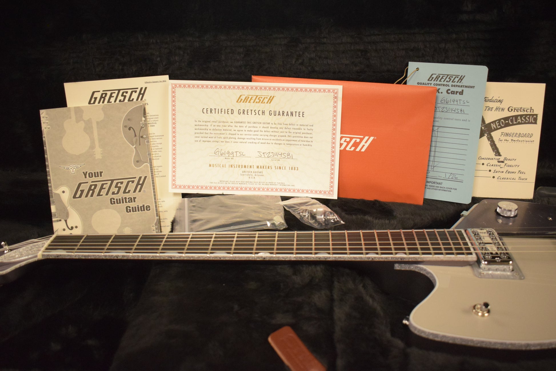 This is a Gretsch Special Run in the Smoke Gray/Violet Metallic color scheme made exclusively for Fuller's Guitar in 2024. Included in the case is a certificate of authenticity, chrome strap locks, case keys, Gretsch OK card, warranty card, and Gretsch guitar guide. This model features TV Jones Classic pickups.
