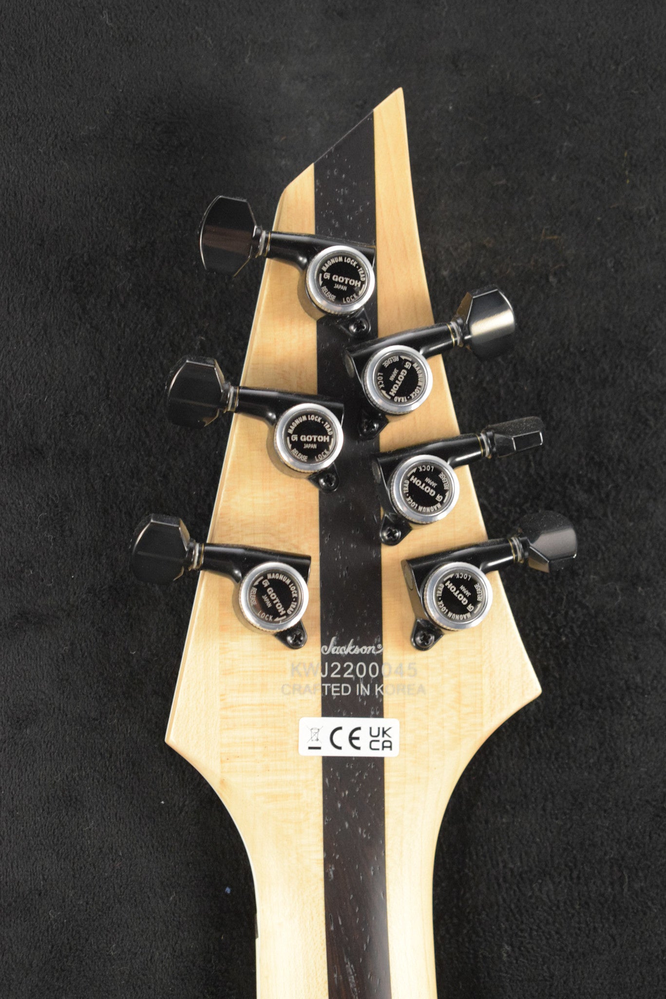 This modernized guitar also boasts unparalleled style with a sandblasted surface that highlights the ash wood grain and unique Baked Red or Baked White finish, complete with a reverse 3x3 AT-1 color matched headstock with white Jackson badge logo and black hardware.