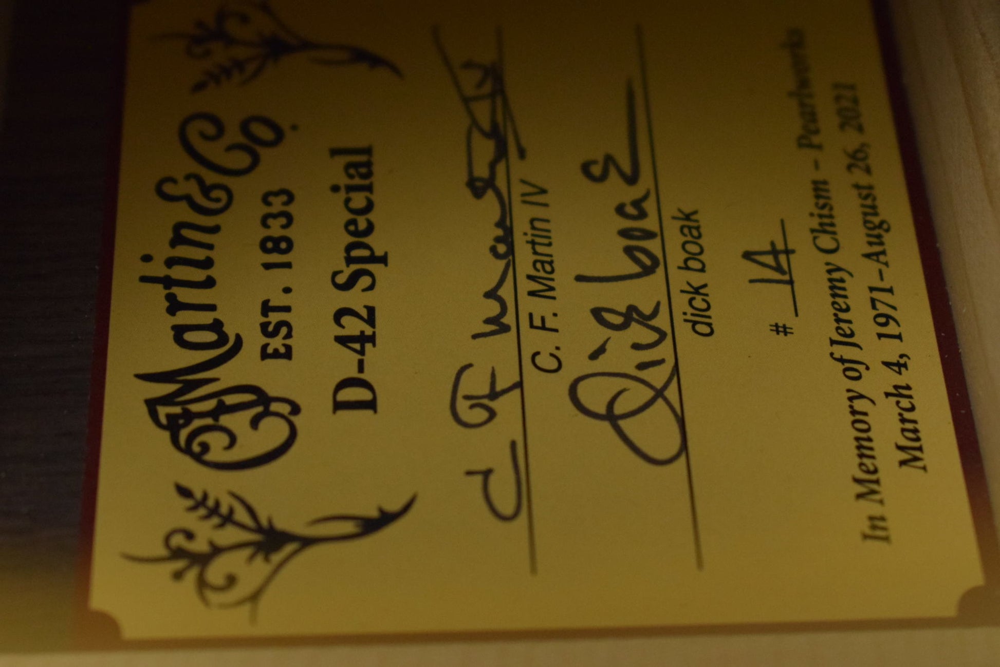In conjunction with former Martin employee Dick Boak, Martin Guitar is proud to introduce a stunning high-end Dreadnought model: the D-42 Special. The idea for this model began nearly 25 years ago when Martin installed its first laser engraving machine, and Boak began experimenting with various ways to utilize it. Boak created an intricate pen and ink illustration of a complex floral design that was meant to be laser engraved into a tortoise pickguard, but the material proved unable to be safely engraved. Fast-forward 23 years, Boak came across his original illustration and thought it would make a beautiful piece if inlaid with pearl. He was right! Working with Bill Seymour and Jeremy Chism at Pearlworks, the trio modified the artwork to allow for the detailed pearl inlay work. The resulting prototype won the approval of Chris Martin IV, who asked Boak to expand the design to the fingerboard and headstock. The model also features premium-grade East Indian rosewood back and sides, with the highest grade of spruce selected for the soundboard. Scalloped forward-shifted X-bracing ensures the open projection for which Martin guitars are prized. Additional vintage-inspired appointments include antique white bindings; abalone inlay along the perimeter of the top, fingerboard extension, and rosette; a full gloss finish with top aging toner; and nickel open-gear tuning machines with butterbean knobs.