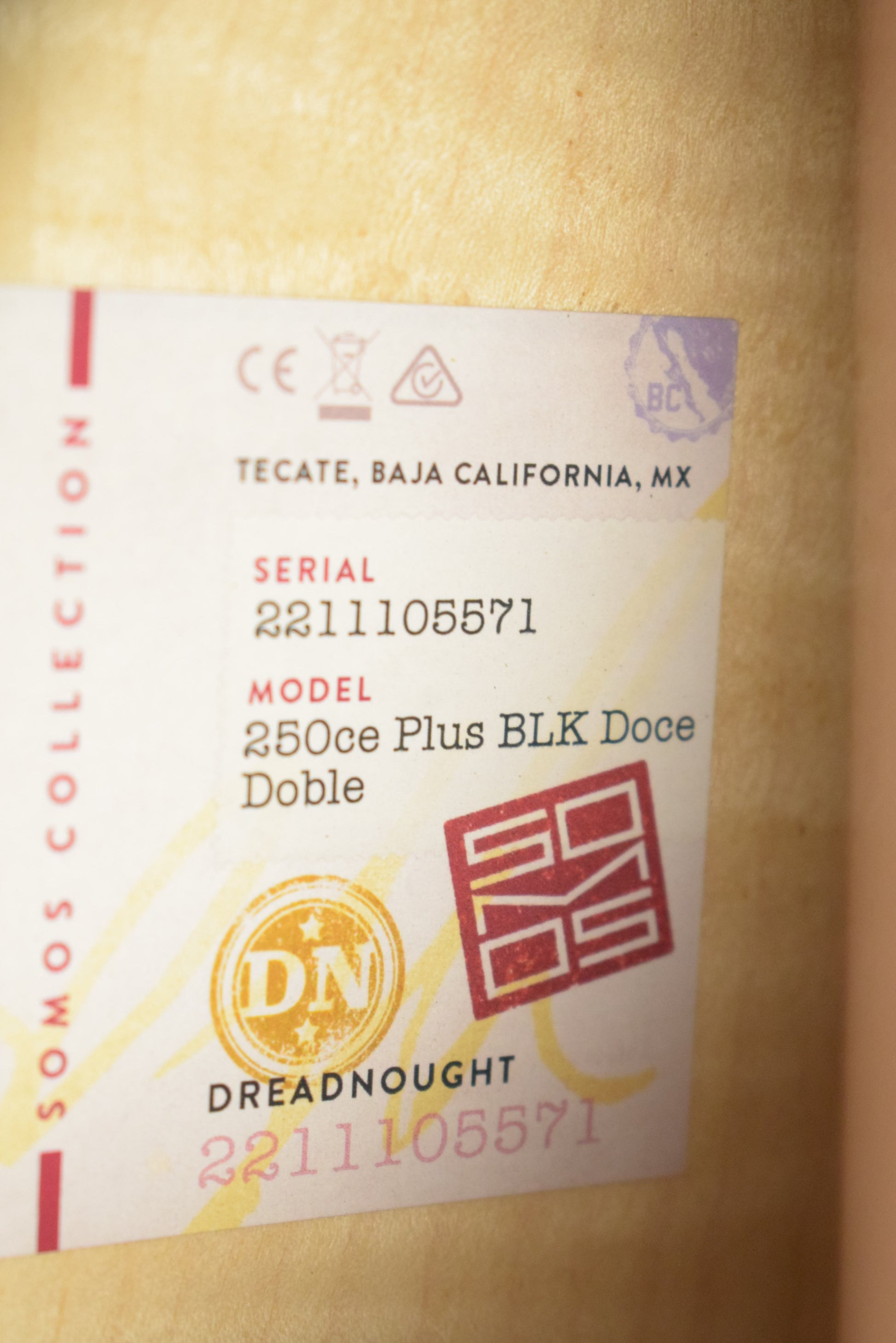 Players hoping to add the uniquely Latin-inspired sounds of the Somos Collection to their toolkit are sure to be enticed by the all-black 250ce Plus BLK Doce Doble, a unison-strung 12-string with a striking visual profile. This cutaway Dreadnought acoustic-electric boasts a solid top of torrefied spruce paired with layered maple back and sides, serving up a clear, bold voice rich with octave sparkle and a dash of aged-in warmth thanks to our proprietary top roasting process. The unison tuning yields a sound that's distinctive within the 12-string category, perfect for traditional Mexican and Latin genres and a welcome addition to other acoustic styles for experimental players. Appointments include an glossy black finish accented with a pearloid pickguard and truss rod cover, satin black tuning machines, white binding, and traditional dot fretboard inlays. Onboard ES2 electronics ensure clean sound for amplified situations, and the included AeroCase offers all the protection of a hardshell case at one-third the weight.