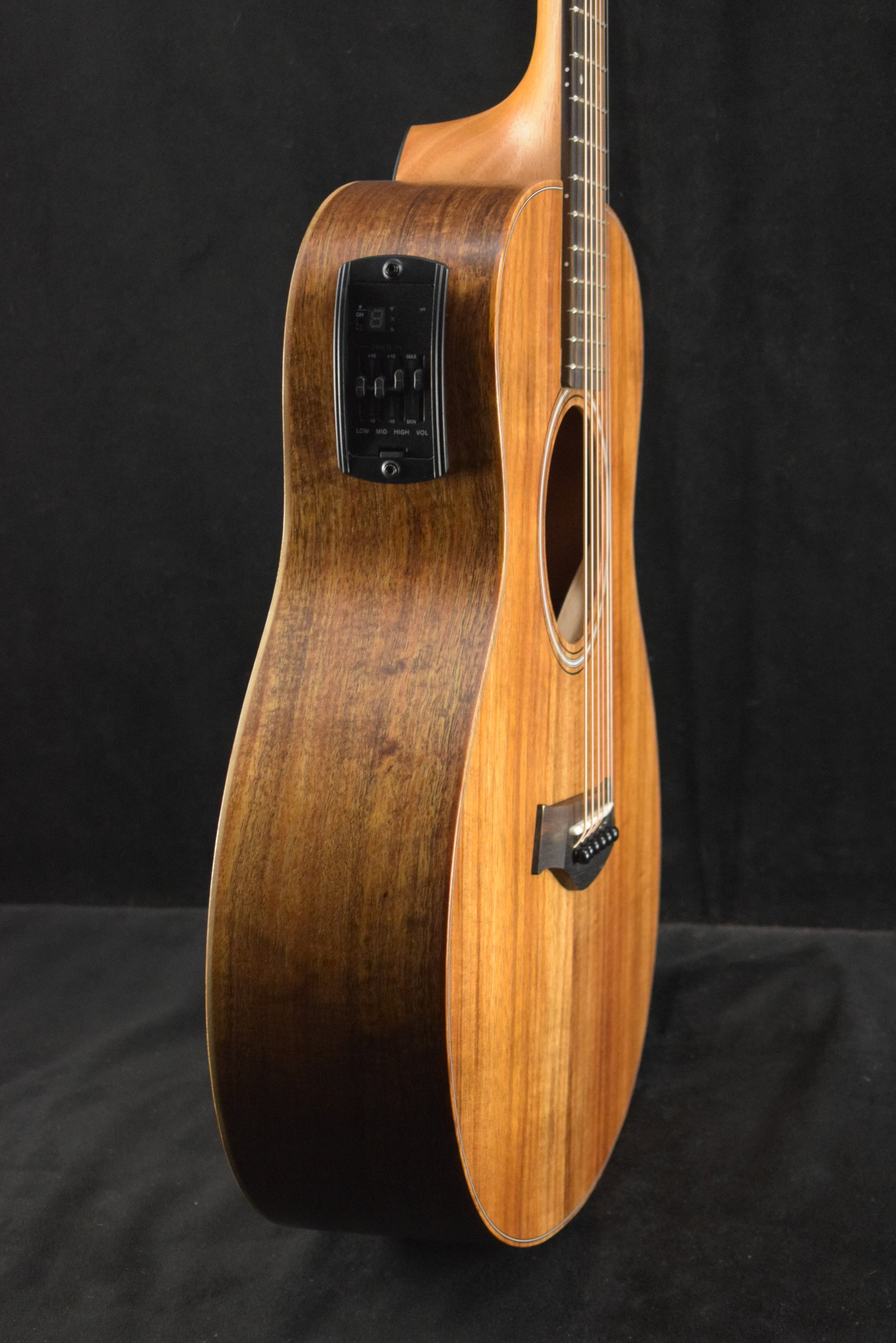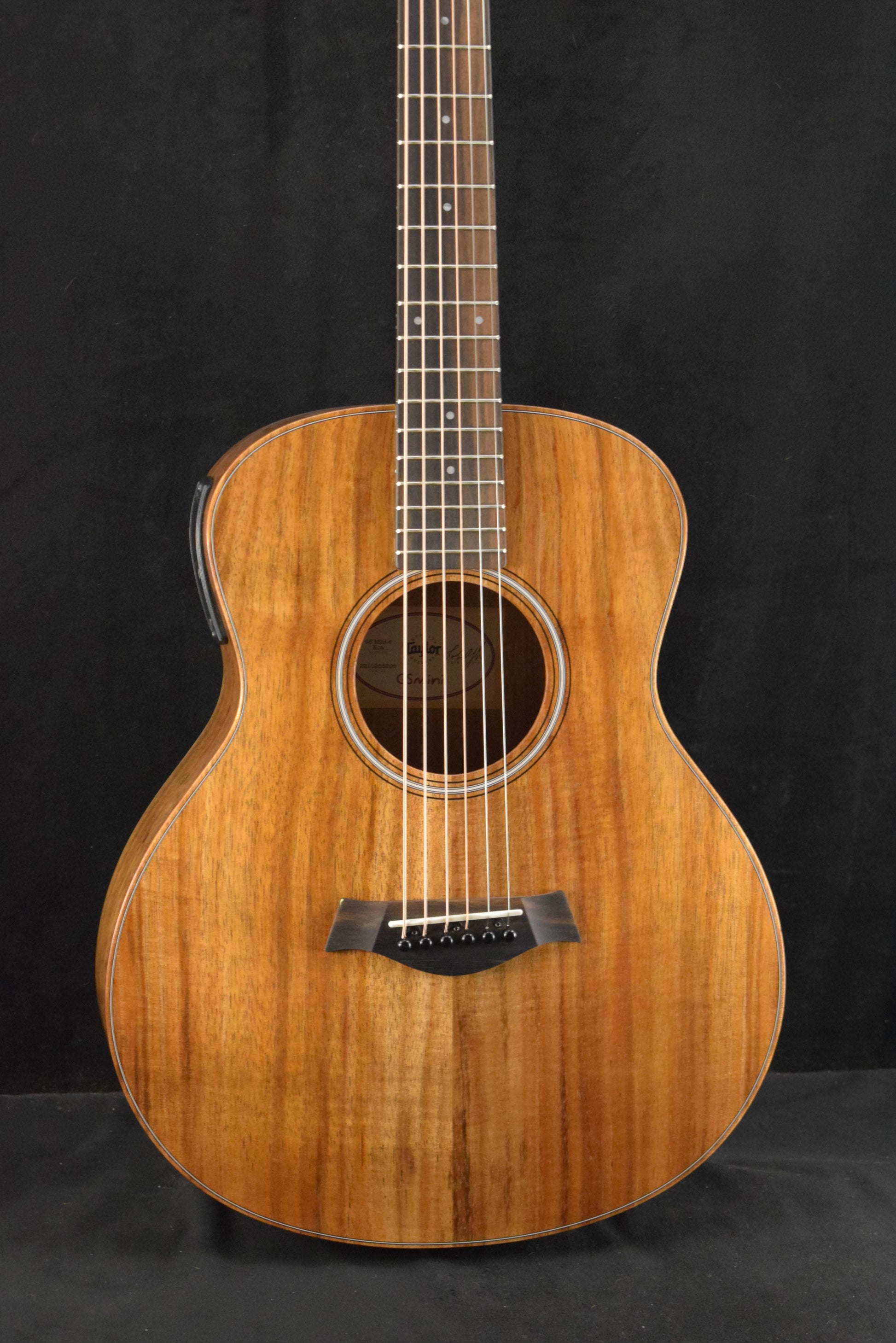 The GS Mini-e Koa brings the vibrant sound and organic beauty of Hawaiian koa to Taylor's ultra-popular reduced-scale acoustic guitar. The GS Mini's compact proportions make it a great choice for players who take their music on the road, and with a solid koa top, this model serves up a rich, bold sound that punches well above its weight for a smaller guitar. The built-in ES-B pickup offers clear, natural amplified tone and includes a digital tuner with an easy-to-read LED display. The GS Mini-e Koa ships with a structured gig bag.