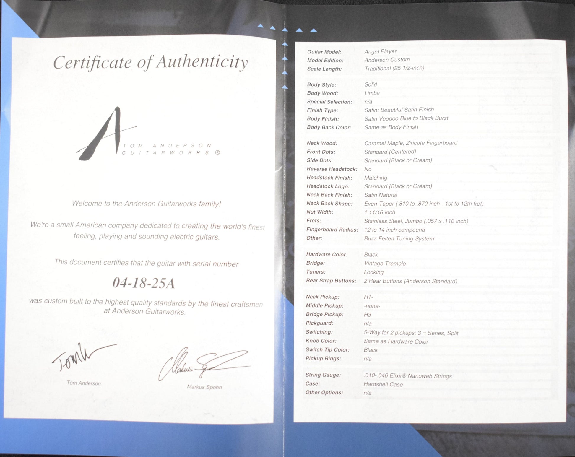 Tom Anderson Angel Player Satin Voodoo Blue to Black Burst